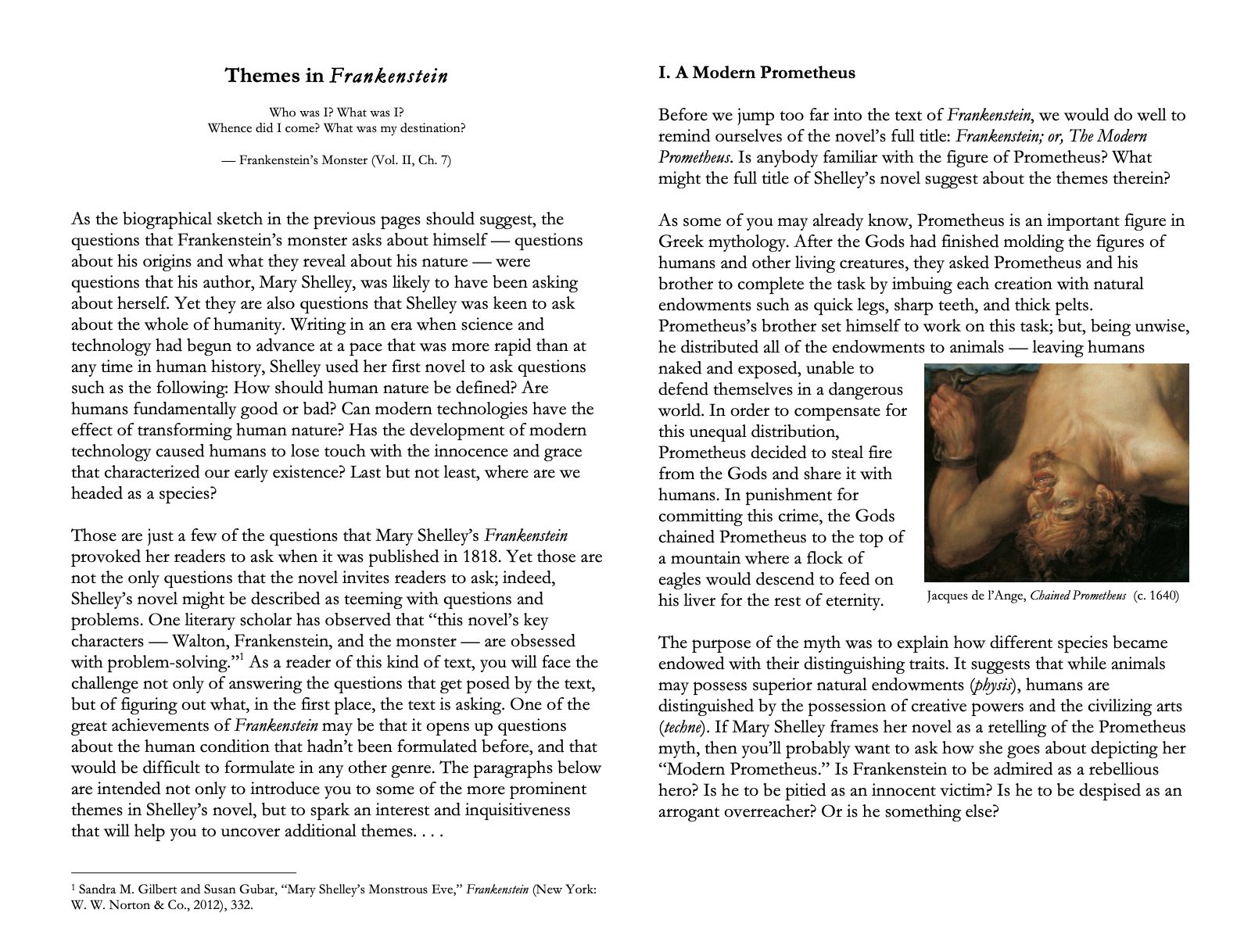 • Themes in Frankenstein (Pre-Reading Handout): Because the full title of Shelley's novel is Frankenstein; or, The Modern Prometheus, this handout introduces students to the Prometheus myth and challenges students to ponder how Shelley might have sought to update or rewrite the myth for the modern era. What happens when humans develop technologies — like Prometheus's act of stealing fire — that should remain the rightful provenance of nature? Should characters like Prometheus and Frankenstein be admired as rebellious heroes? Or should they be despised as an arrogant overreachers? Get students thinking before they even crack the cover of Shelley's novel! (2 pages)