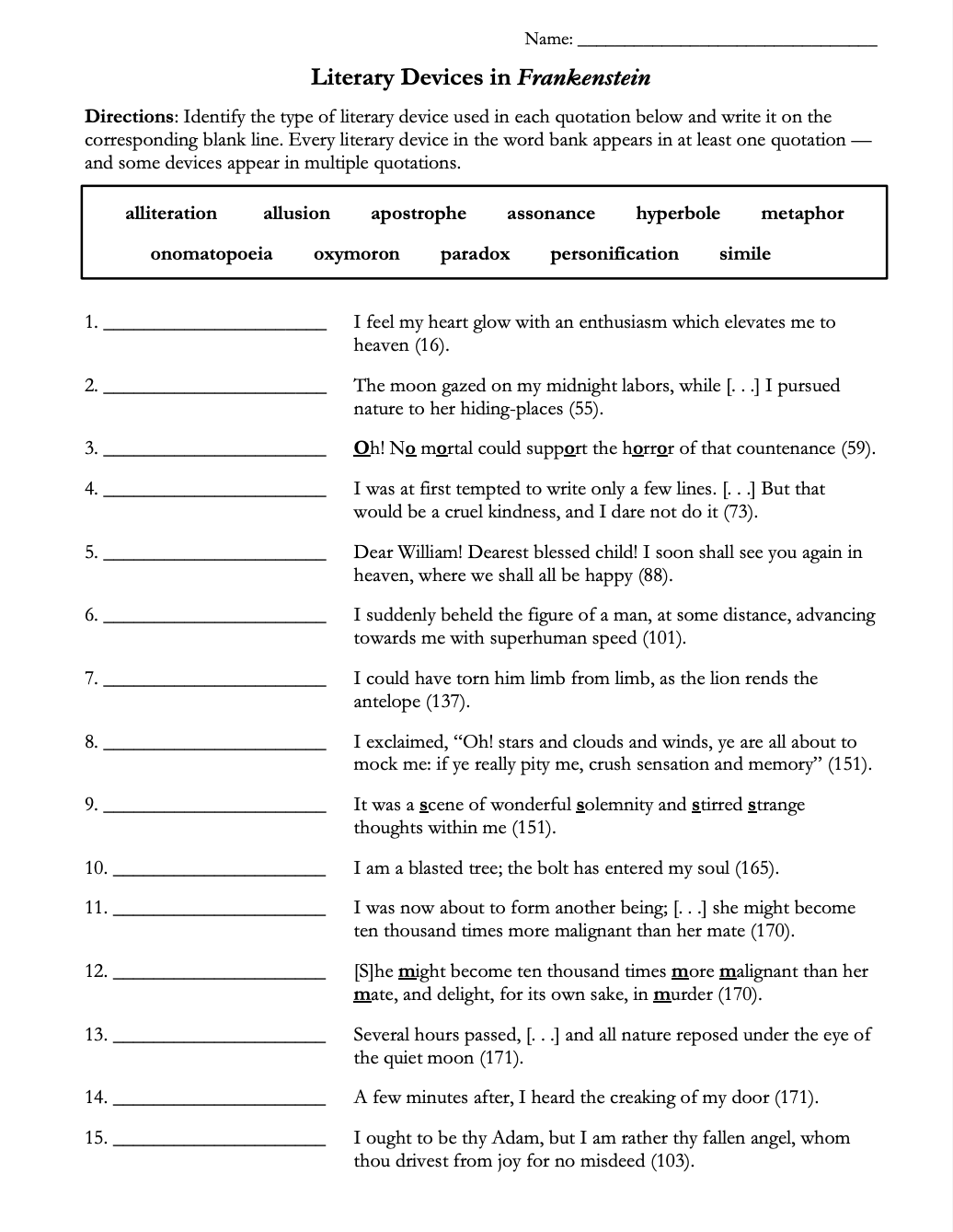 • Literary Devices Worksheet: This worksheet challenges students to identify the literary devices used in fifteen quotations from Frankenstein. The literary devices include metaphor, simile, personification, hyperbole, oxymoron, allusion, onomatopoeia, and more. This bundle also features a glossary with definitions of the literary devices as well as examples of how each device is used in Shelley's novel — so you can review the devices with students before they tackle the worksheet. The worksheet can be used either as a quiz or as a fun refresher. Answer key included. (3 pages)