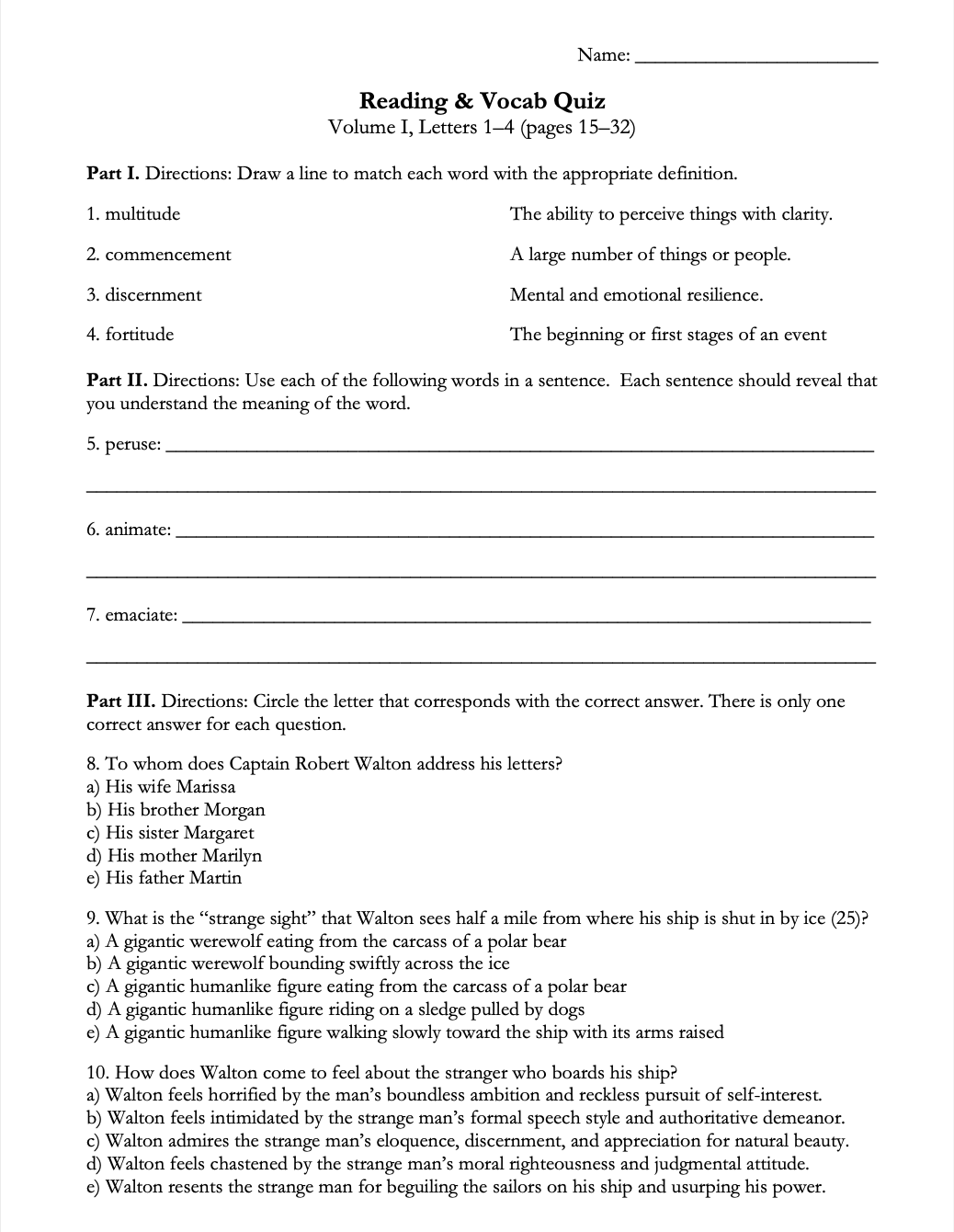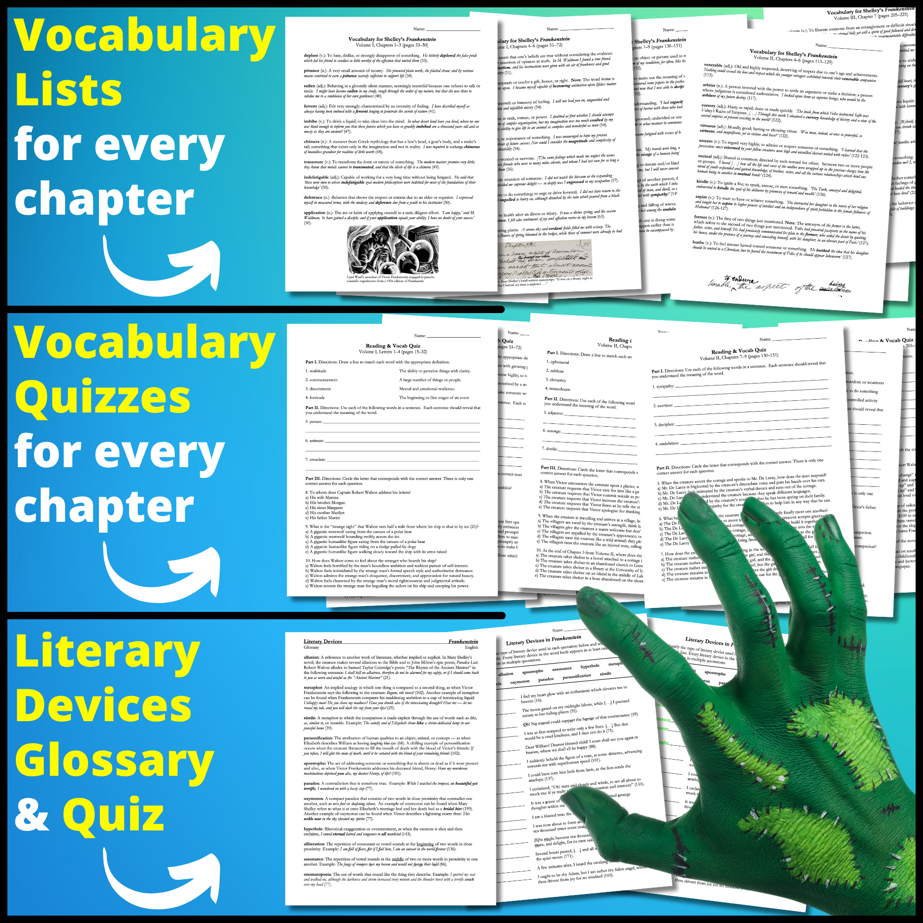 • Vocabulary Lists: Lists of 10 vocabulary words for every reading assignment, complete with definitions and sample sentences with the words as used in Frankenstein. A total of 100 words. (10 pages)