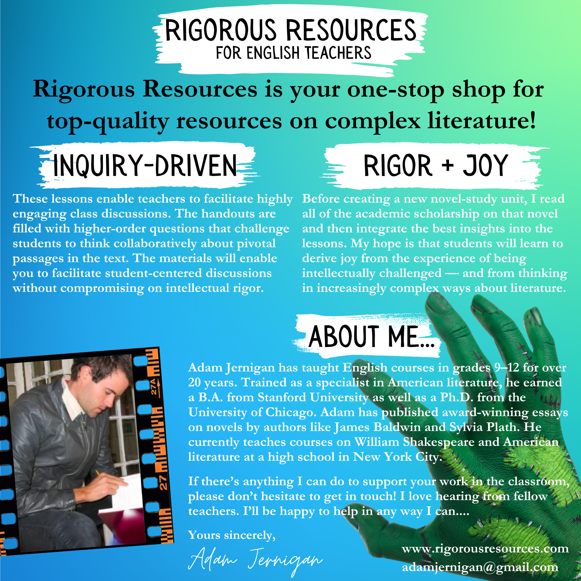 I'm eager to do everything I can to help ensure that you have an amazing experience with teaching Mary Shelley's masterpiece. If you have any questions along the way, please don't hesitate to get in touch via the email address below. I'm always happy to hear from fellow teachers who share a passion for great literature!