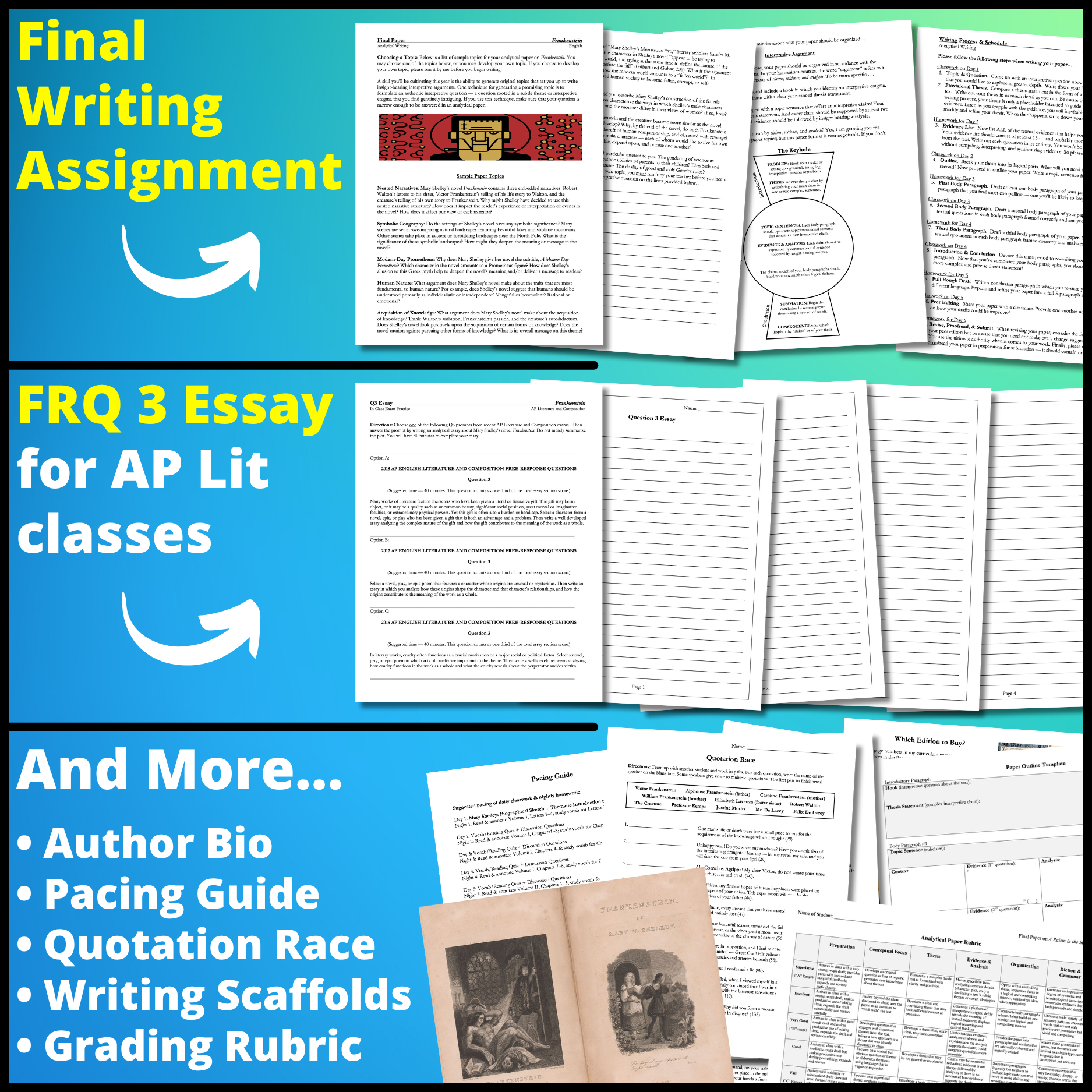 • Q3 Practice Essay: Designed for AP Lit teachers, this in-class practice essay will allow students to rehearse the "Q3" essay from the AP Literature and Composition Exam. The assignment asks students to choose from among three recent Q3 prompts that featured Frankenstein as one of the recommended works of literary merit. (5 pages)