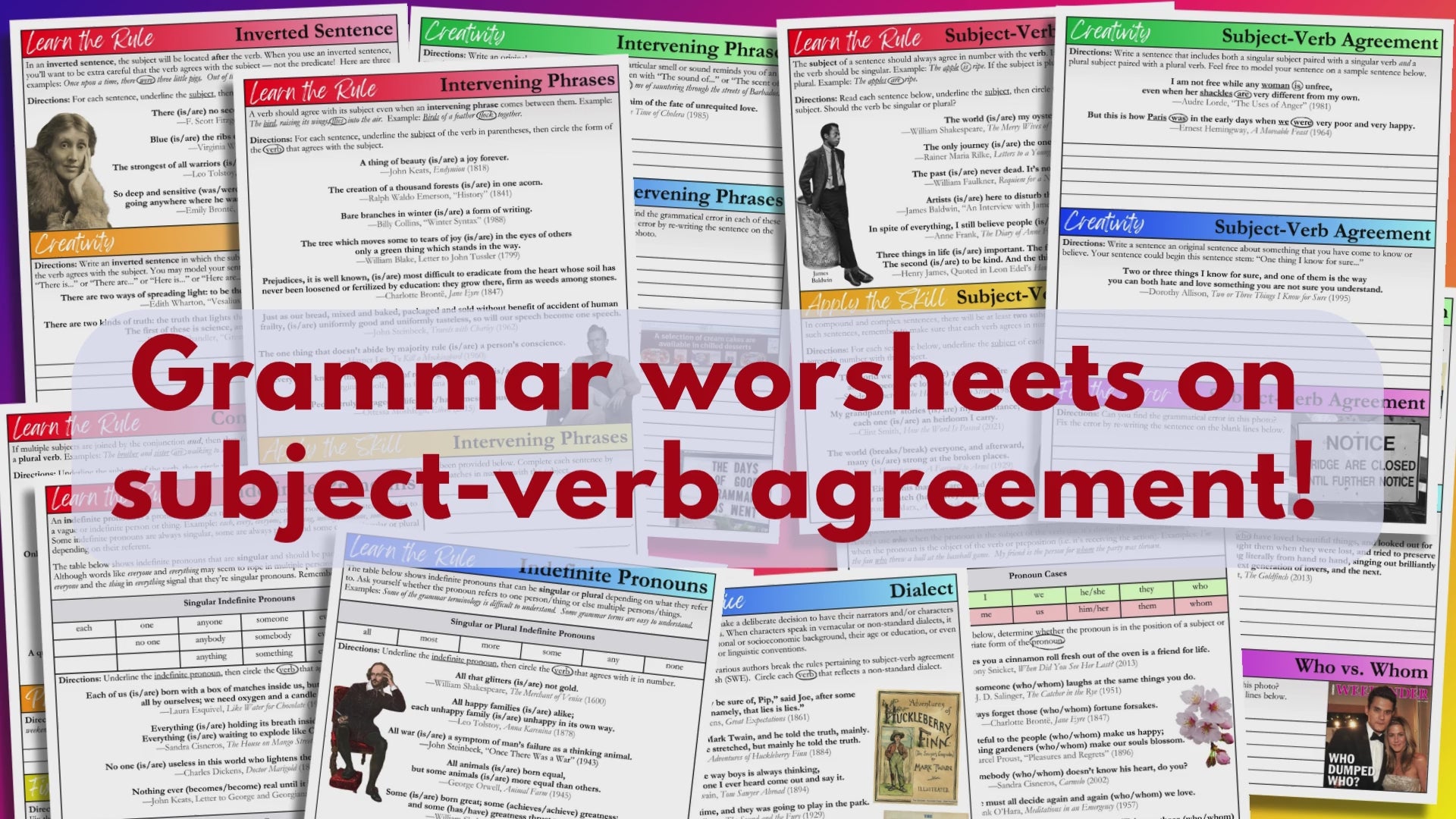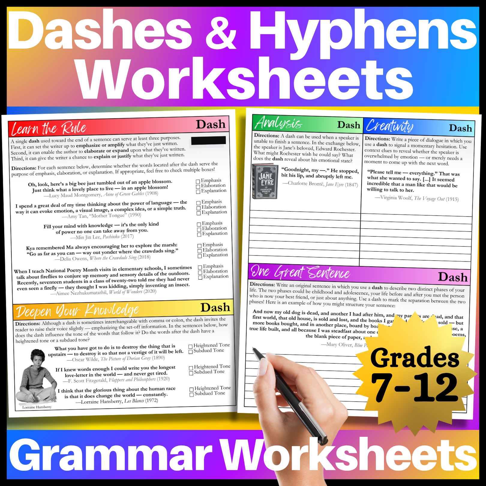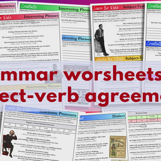Put the "fun" back in grammar fundamentals! The 36 double-sided worksheets in this bundle feature over 180 exercises on the most important topics in grammar: subject-verb agreement, misplaced modifiers, dangling participles, comma splices, semicolons, hyphens, and dozens more! The handouts introduce students to the grammatical rules for combining various types of clauses, phrases, and punctuation marks. Of equal importance, the worksheets illuminate numerous stylistic techniques used by famous authors to generate beautiful sentences — and give students ample opportunities to craft their own dazzling sentences!