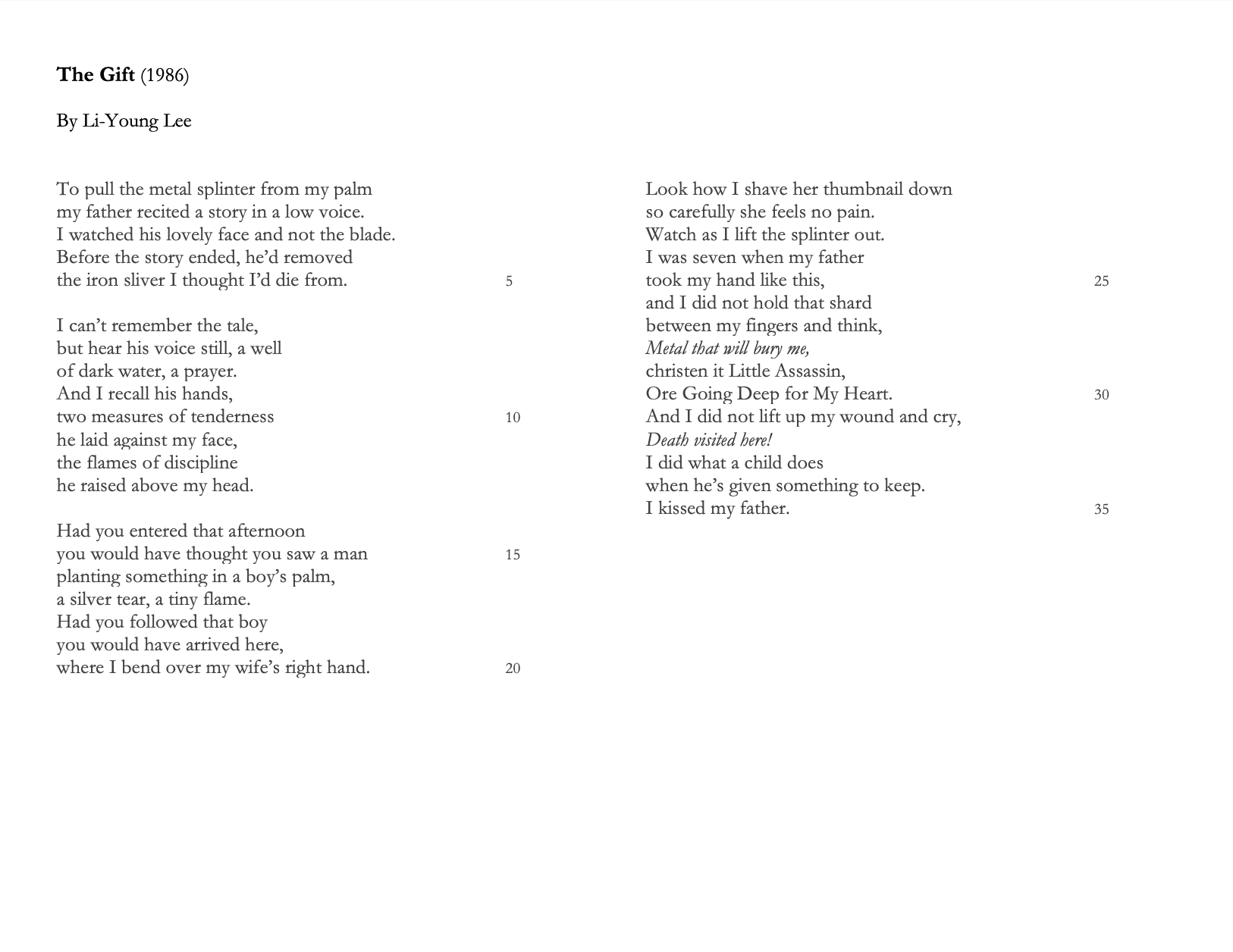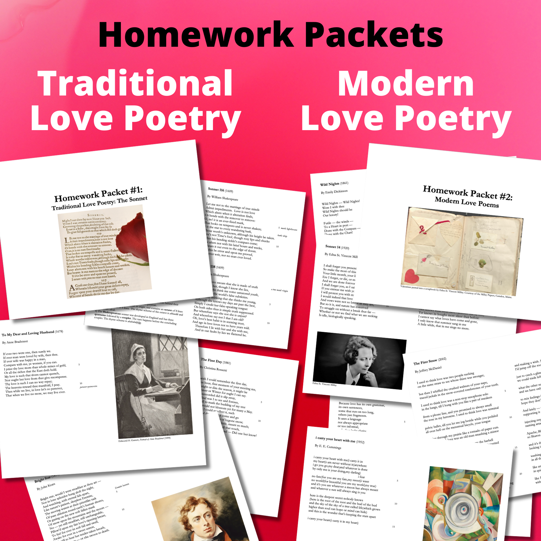 • Homework Packets with Poems (5-6 Poems per Packet): The 10 homework packets contain a total of 50+ poems by a diverse range of award-winning poets such as William Shakespeare, John Keats, Emily Dickinson, Christina Rossetti, Robert Frost, Langston Hughes, Sylvia Plath, Robert Hayden, Theodore Roethke, E. E. Cummings, Audre Lorde, Mary Oliver, Gary Soto, Li-Young Lee, Ada Limón, and others. The poems are collected into eight reading packets that focus on prominent literary devices and themes: 1) poems using sensory imagery, 2) poems using figurative language, 3) love poems, 4) poems on ethical dilemmas, and 5) poems on complex parent-child dynamics. Because teenagers have a lot to say about these themes, the poems will set the stage for your class to have fascinating and profoundly productive discussions!! (60 pages)