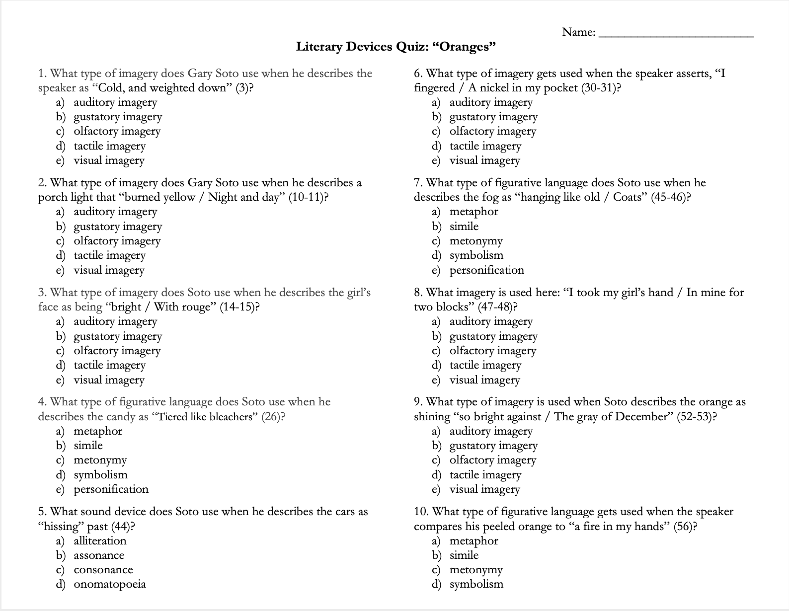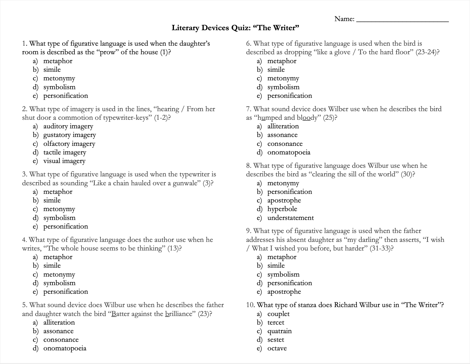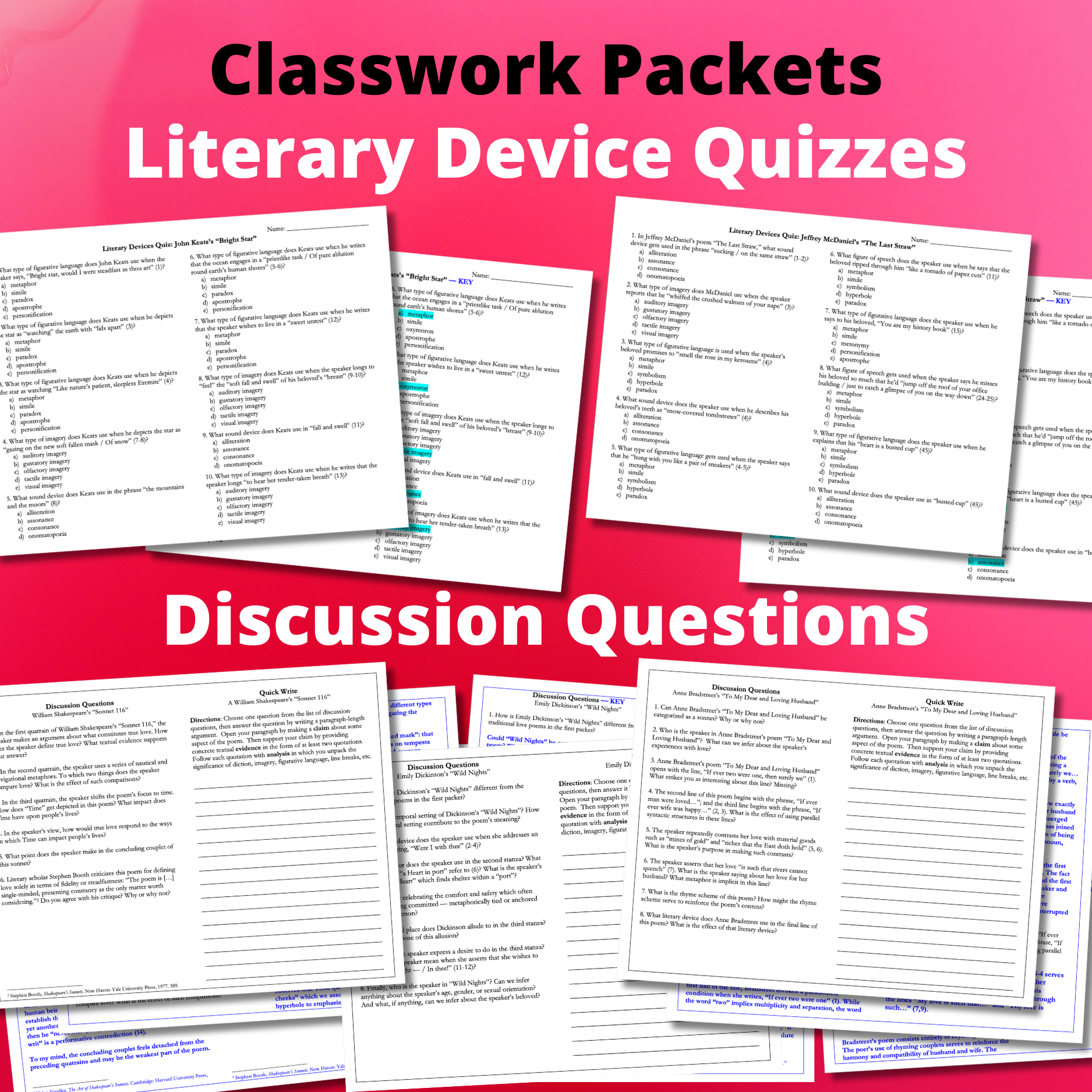 • Literary Devices Quizzes: A total of ten quizzes, each with 10 questions about a wide range of literary devices: metaphor, personification, symbolism, imagery, alliteration, etc. Open each class with a quiz to assess whether your students can accurately identify the literary devices used in the poems from the homework packets. Answer keys included. (20 pages).