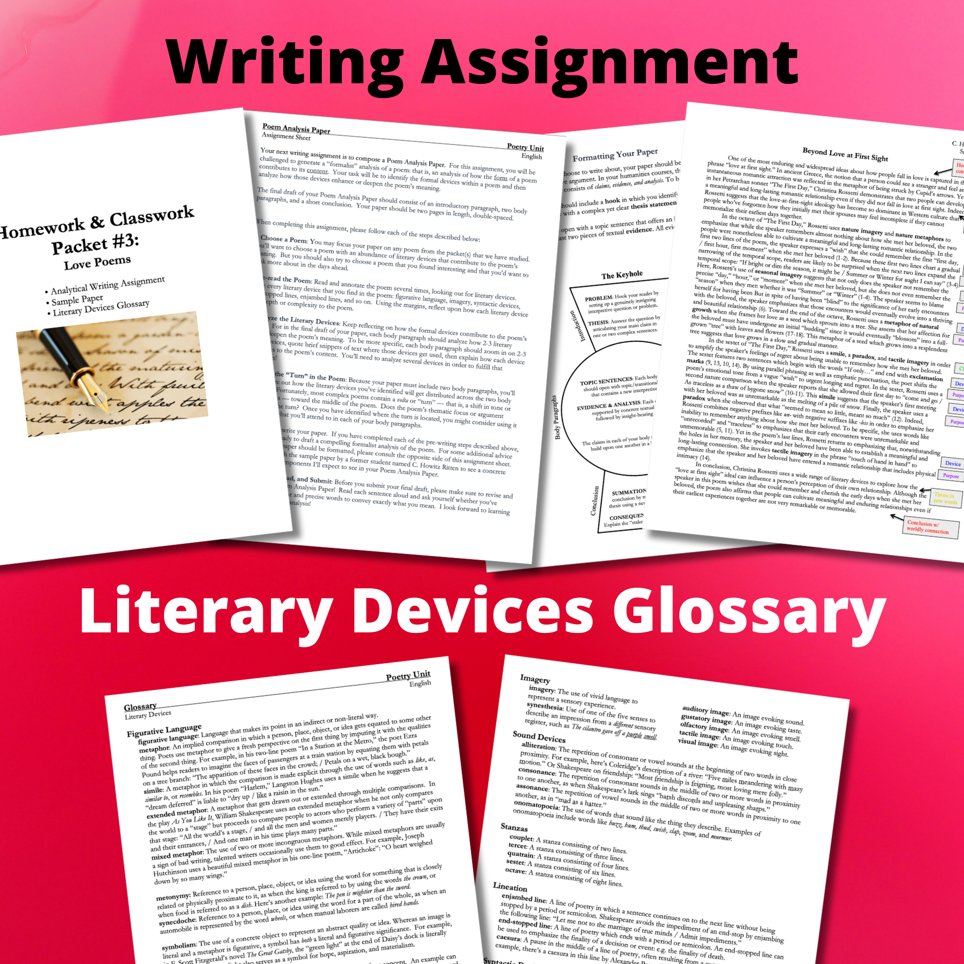 • Analytical Writing Assignment: Challenge students to take their interpretations one step further by writing an analytical paper on a poem of their choice. The assignment sheet contains detailed instructions for how to generate a formalist analysis of a poem (analyzing how the poem's formal features contribute to its meaning). This kind of formalist analysis is exactly what students are asked to generate on the AP Literature exam! Sample paper included. (15 pages)