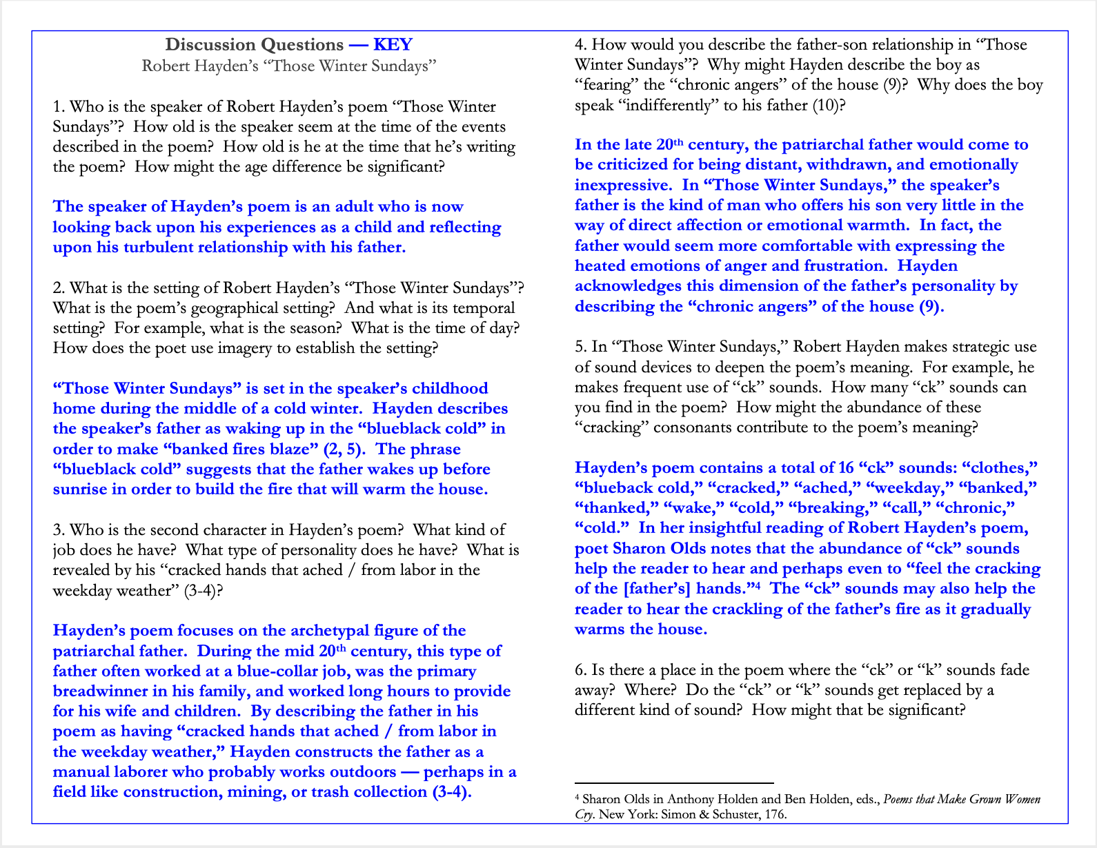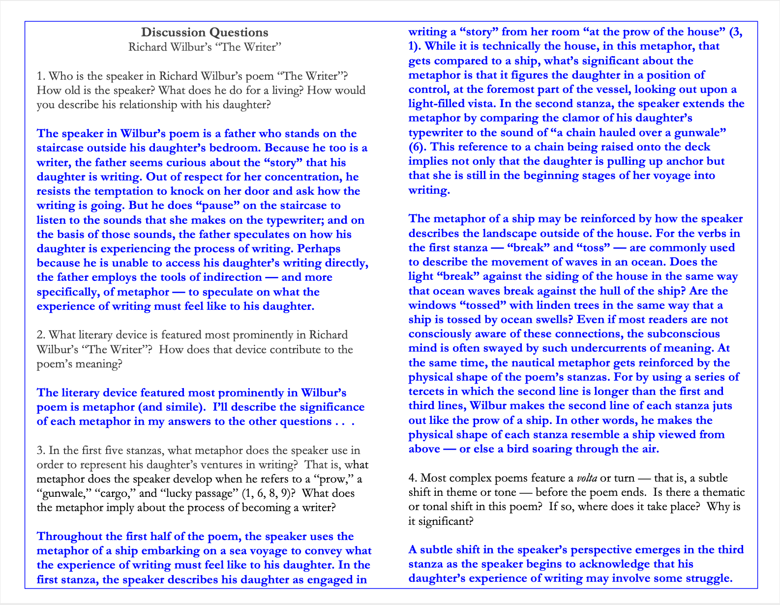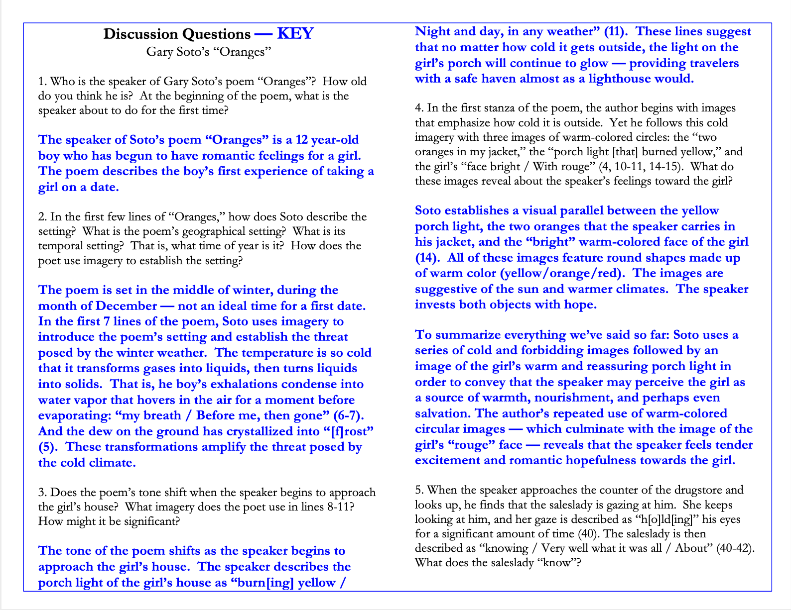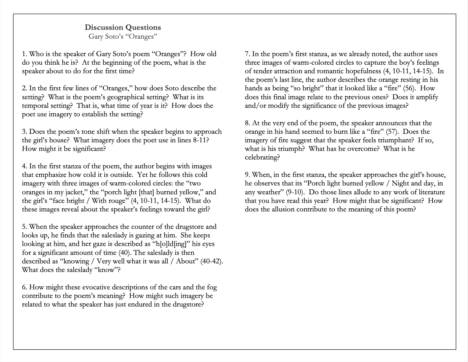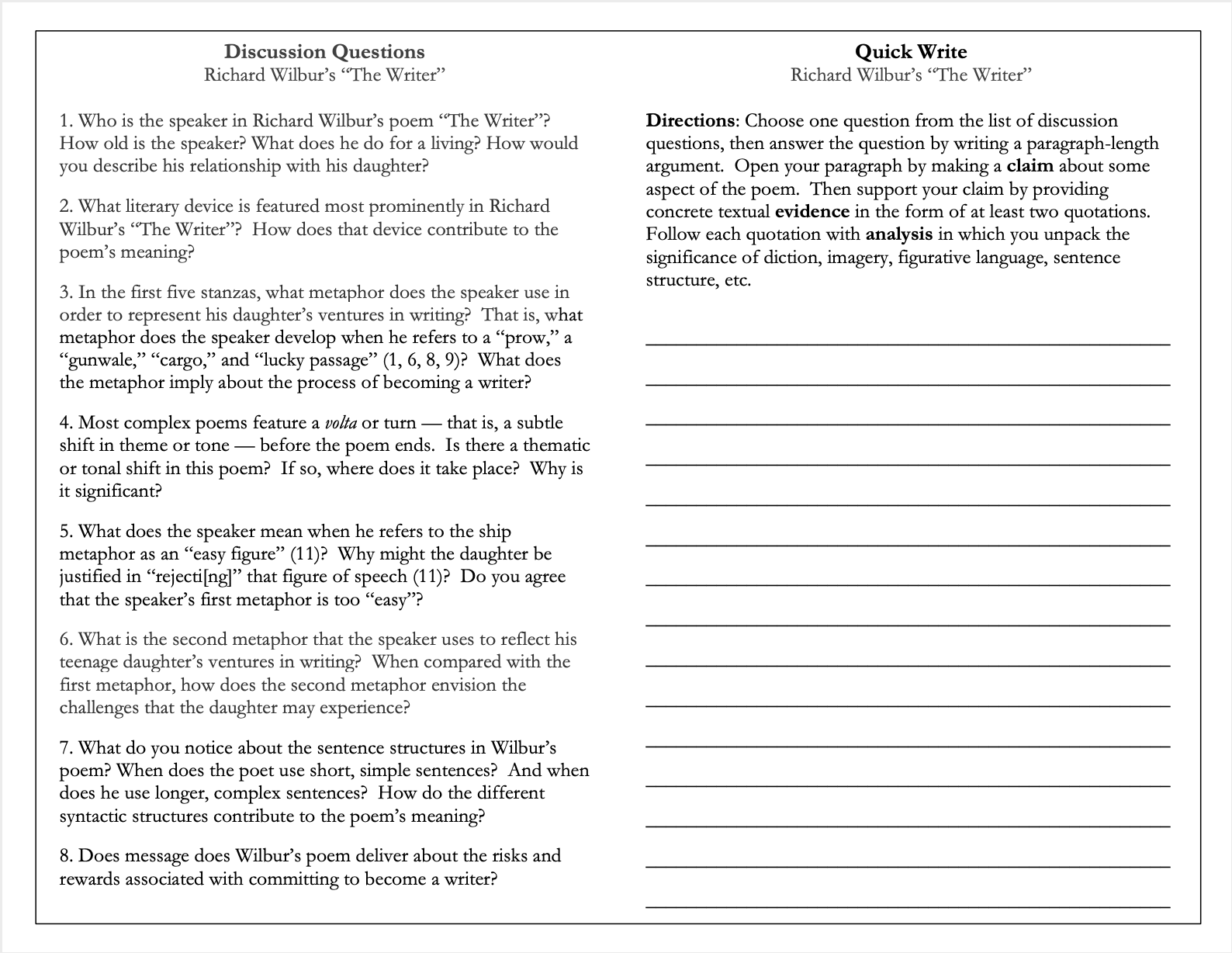 • Discussion Questions: This bundle features a list of discussion questions for the first poem in each of the homework packets. The discussion questions will ensure that every class discussion gets started in a productive manner. Every discussion question is grounded in concrete textual details and challenges students to arrive at lucid interpretive insights! The questions lend themselves to a range of different pedagogical uses: 1) to focus students’ thinking prior to beginning a discussion, 2) to prompt in-class writing, 3) to assign written reflections for homework, etc. Guaranteed to elicit student engagement and foster deep thinking! Answer keys included. (50 pages)