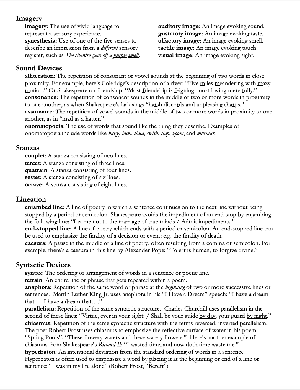 • Literary Devices Glossary: A glossary with definitions and examples of the various types of figurative language, imagery, stanzas, and syntactic devices. Many teachers already have a glossary of literary devices, but I'm providing this in case you need one. (2 pages)