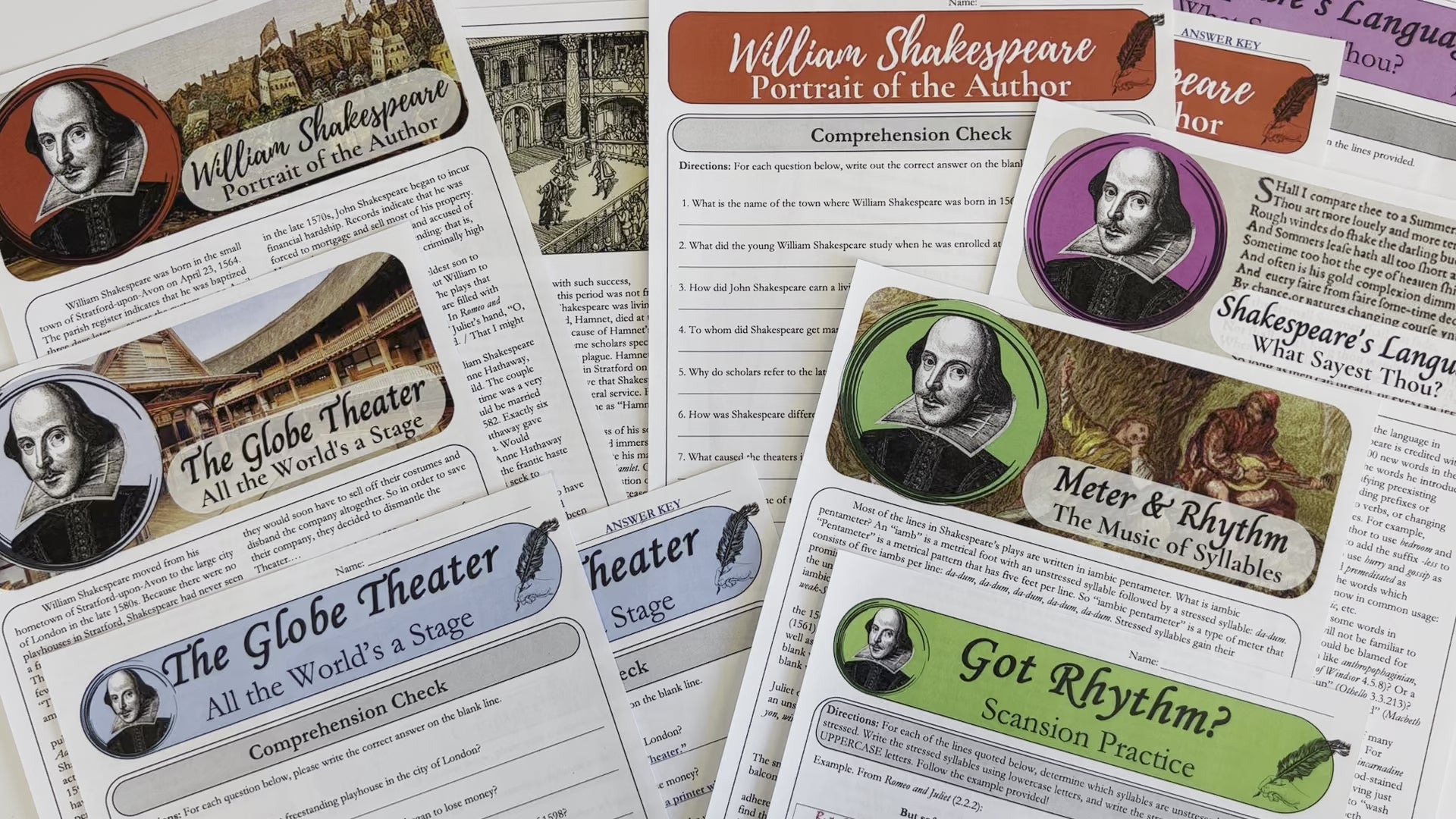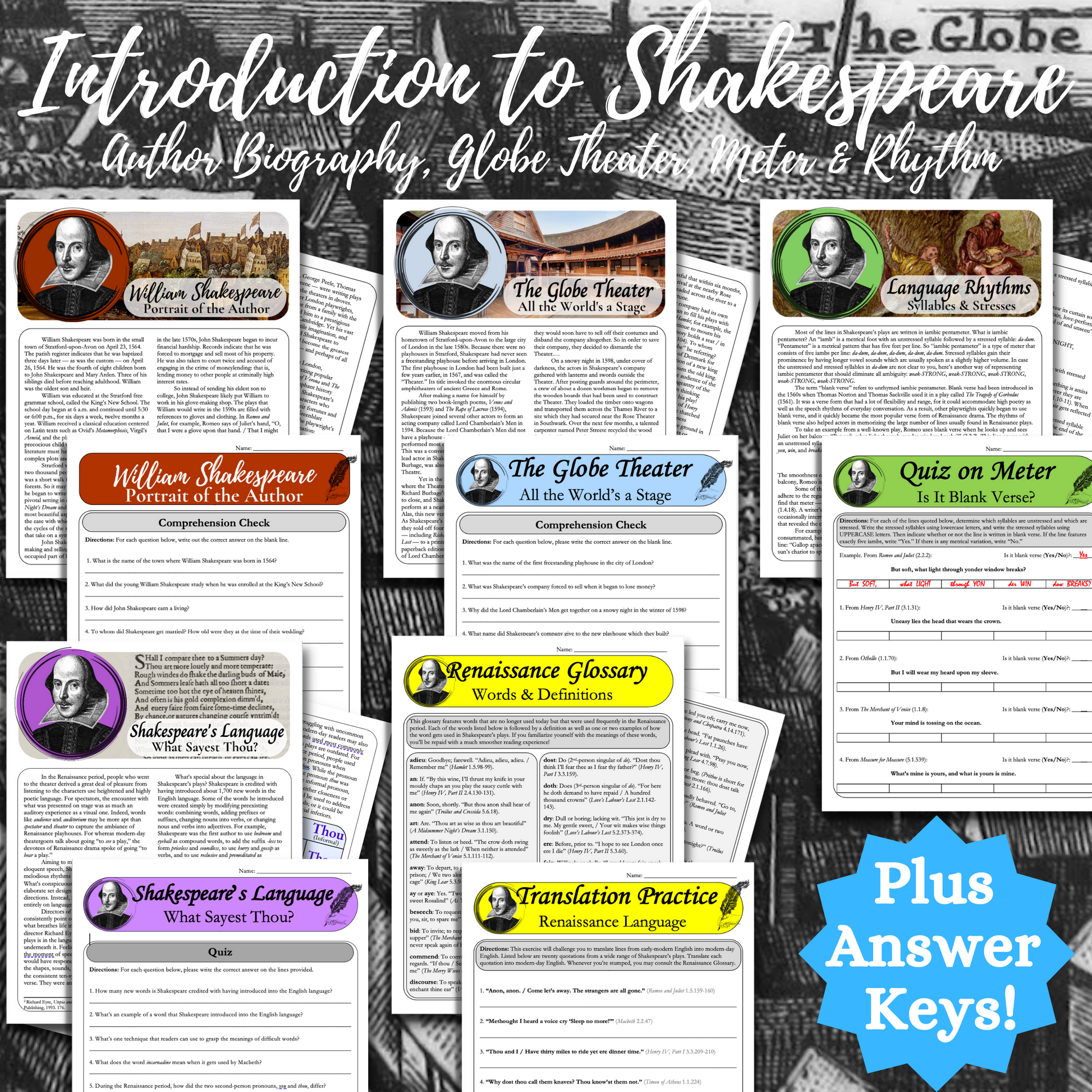 • Introduction to Shakespeare's World: The 30-page introduction includes five handouts covering topics like Shakespeare's biography, the language of Renaissance England, the construction of the Globe Theater, how to recognize iambic pentameter, and more. Every handout is followed by a comprehension check, practice exercise, or quiz. You could spend up to a week with the introductory handouts — or skip them altogether. Answer keys included. (30 pages)