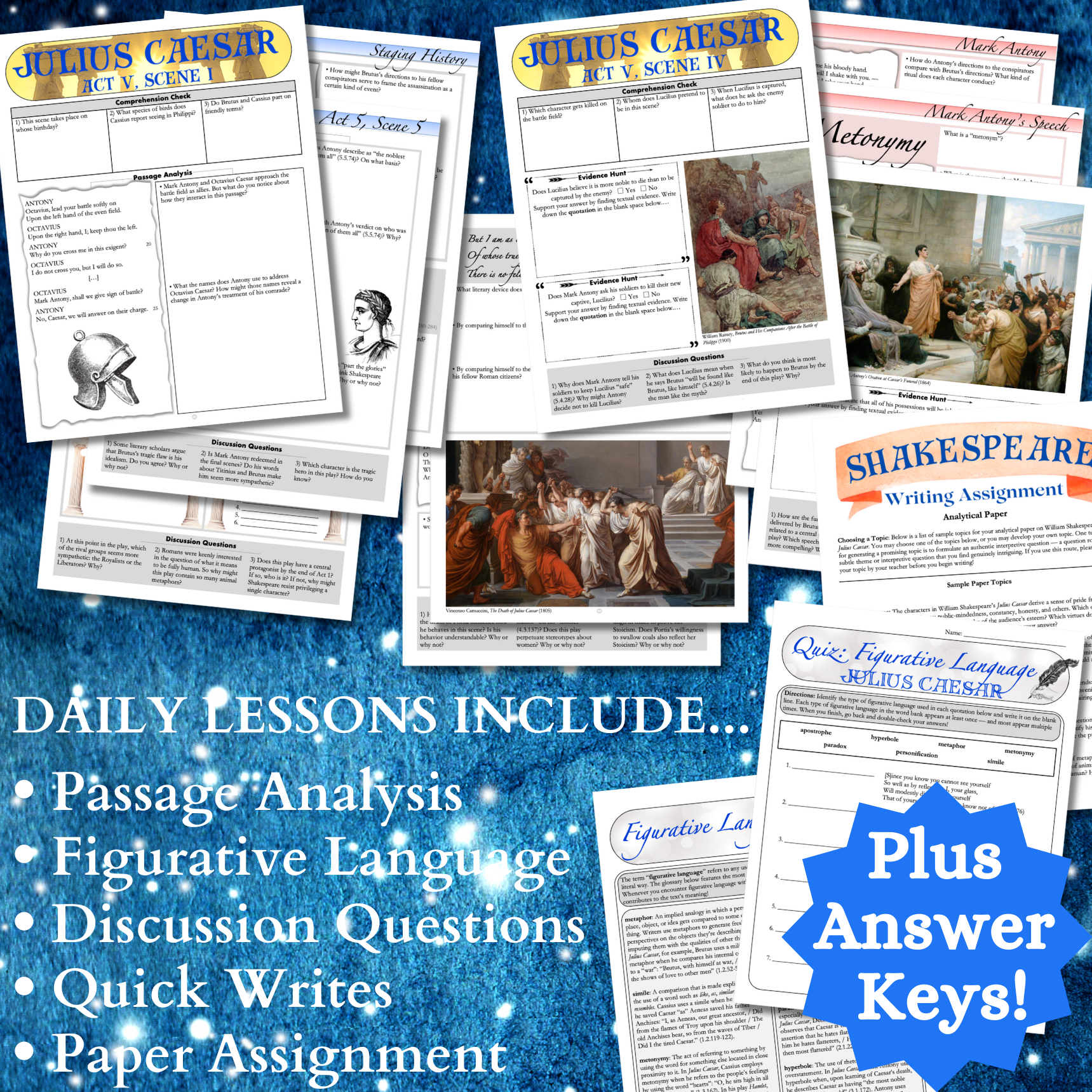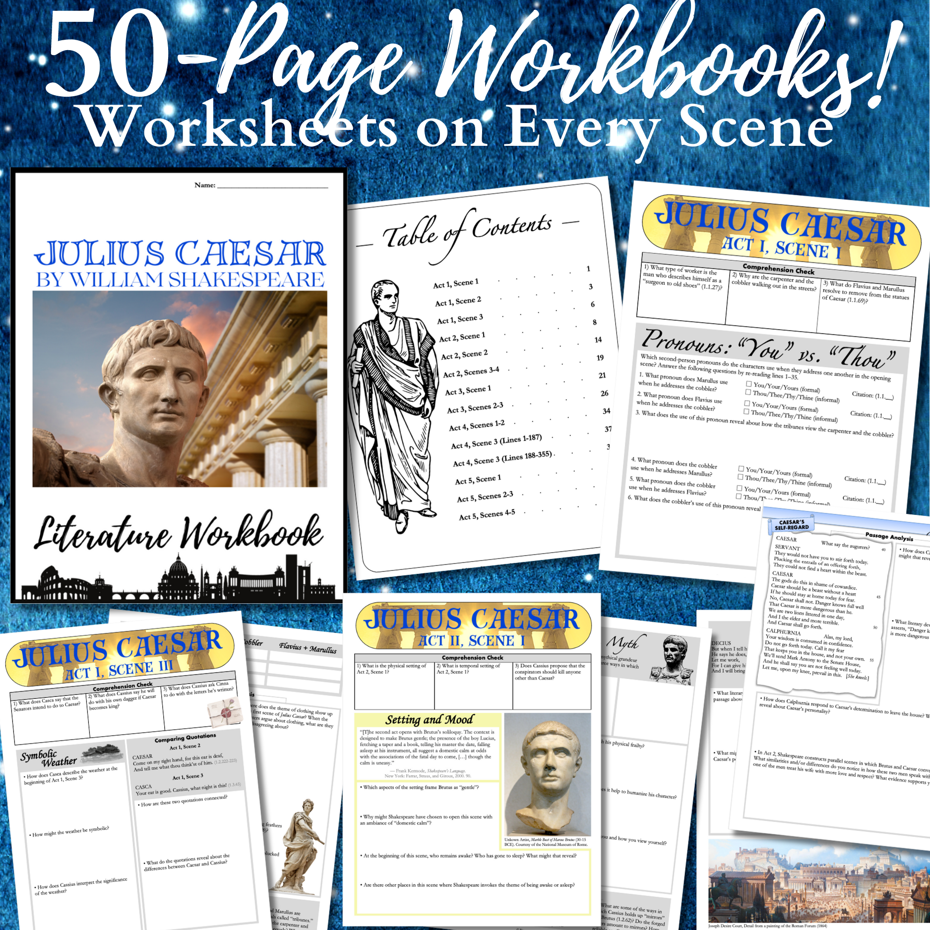 • STUDENT WORKBOOKS on Julius Caesar: The 50-page workbook features highly engaging worksheets on every scene in Julius Caesar. Each worksheet is divided into sections which invite students to engage with the text in a variety of different ways: