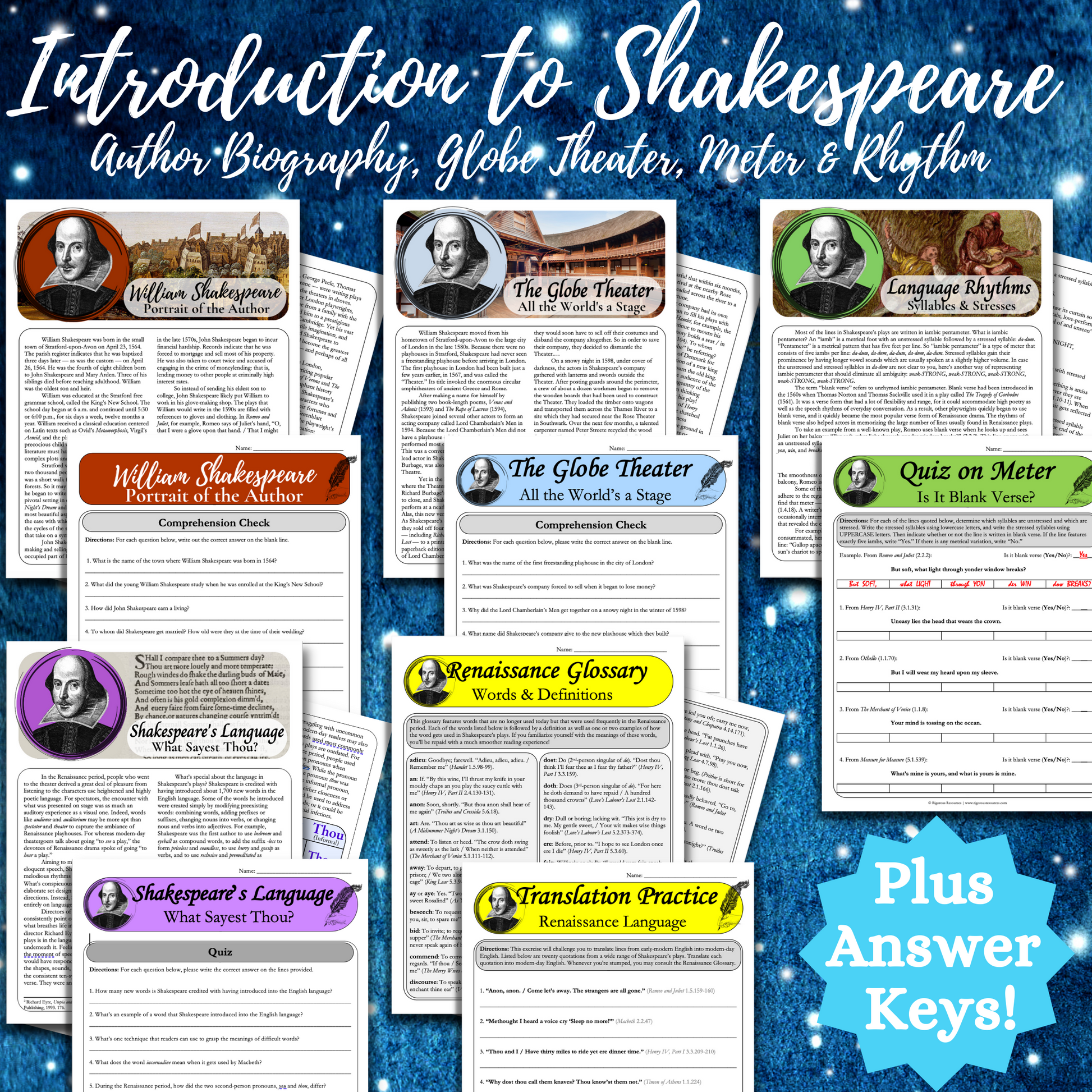 • Introduction to Shakespeare’s World: The 30-page introduction includes five handouts covering topics like Shakespeare’s biography, the language of Renaissance England, the construction of the Globe Theater, how to recognize iambic pentameter, and more. Every handout is followed by a comprehension check, practice exercise, or quiz. You could spend up to a week with the introductory handouts — or skip them altogether. Answer keys included. (30 pages)
