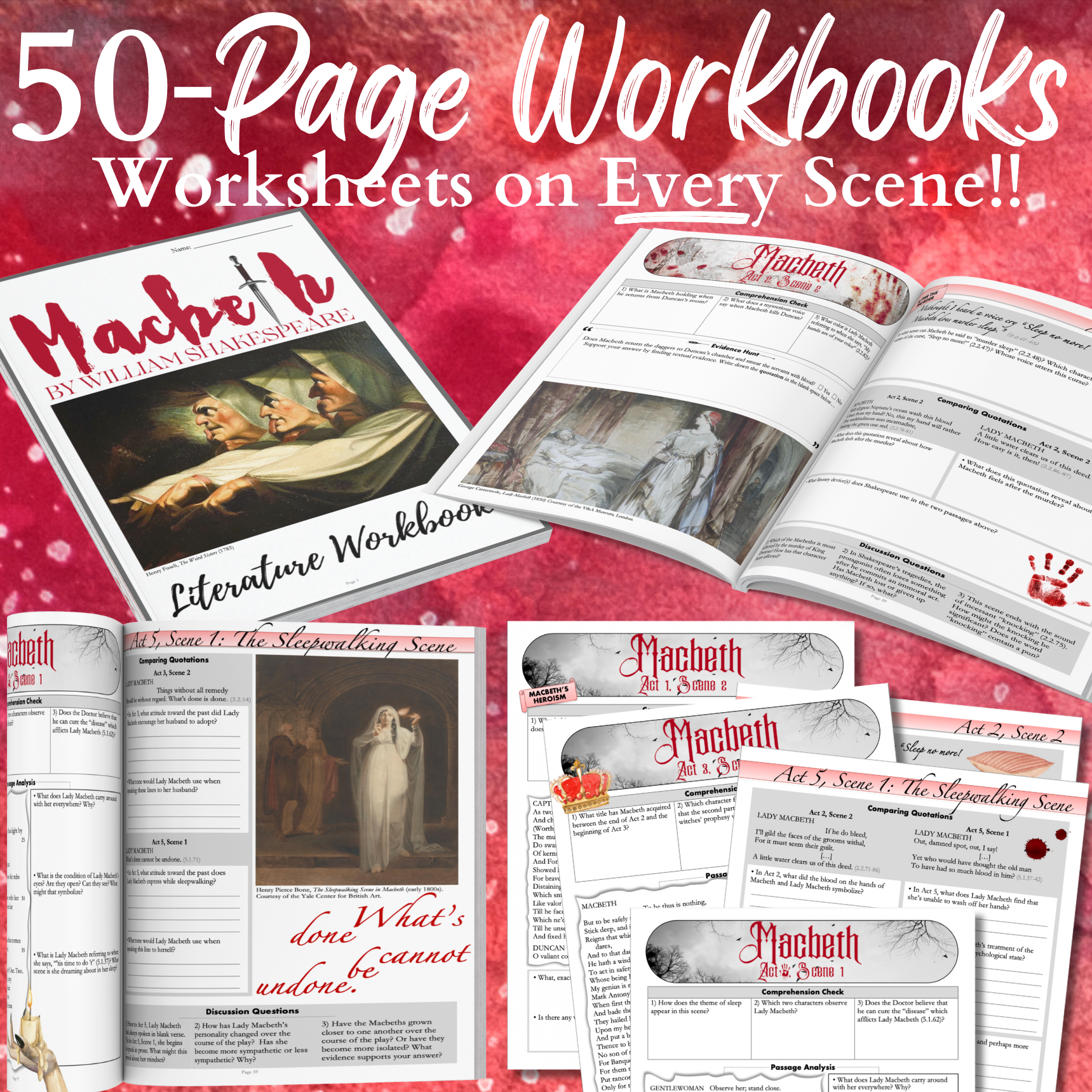 • STUDENT WORKBOOKS on Macbeth: The 70-page workbook features highly engaging worksheets on every scene in Macbeth. Each worksheet is divided into sections which invite students to engage with the text in a variety of different ways: