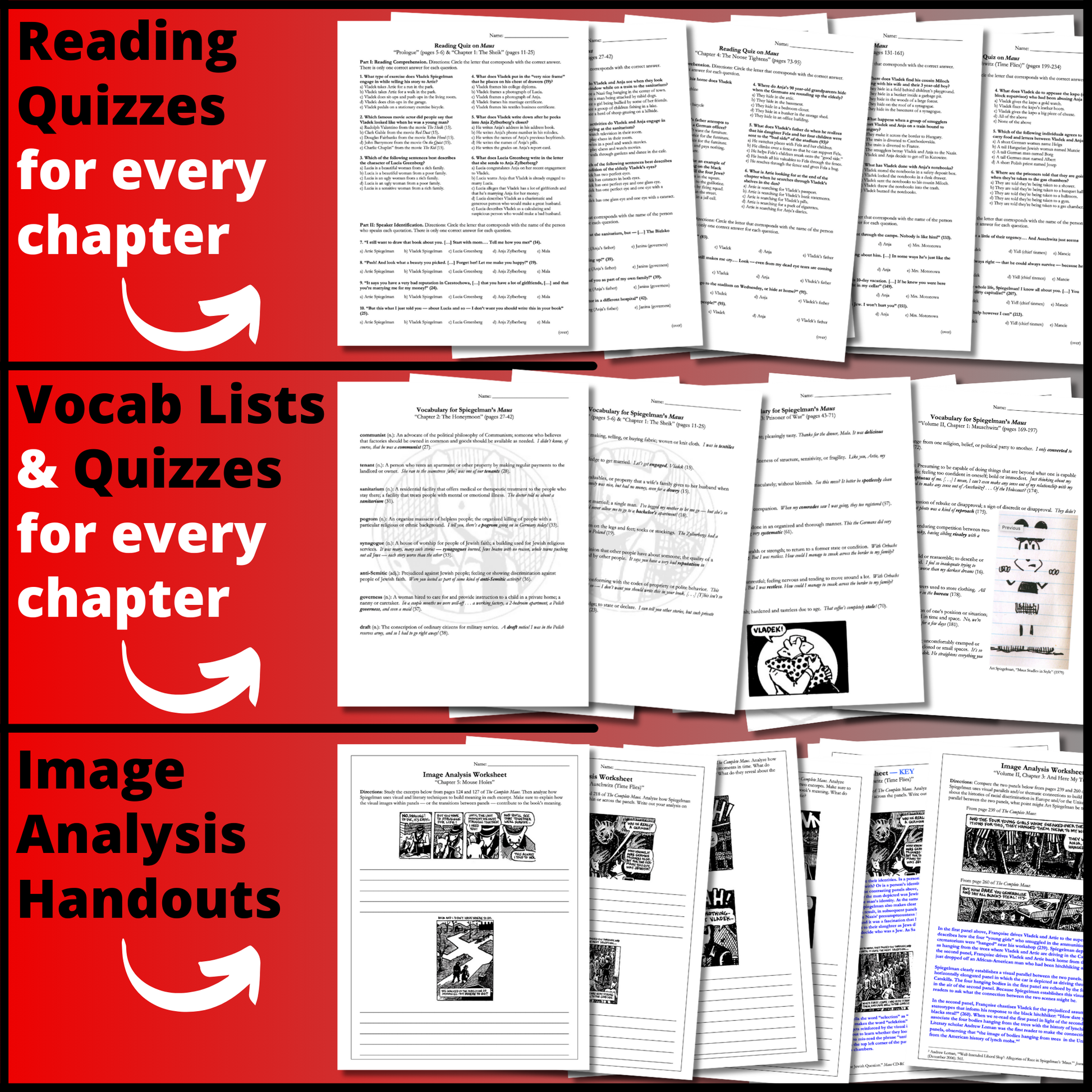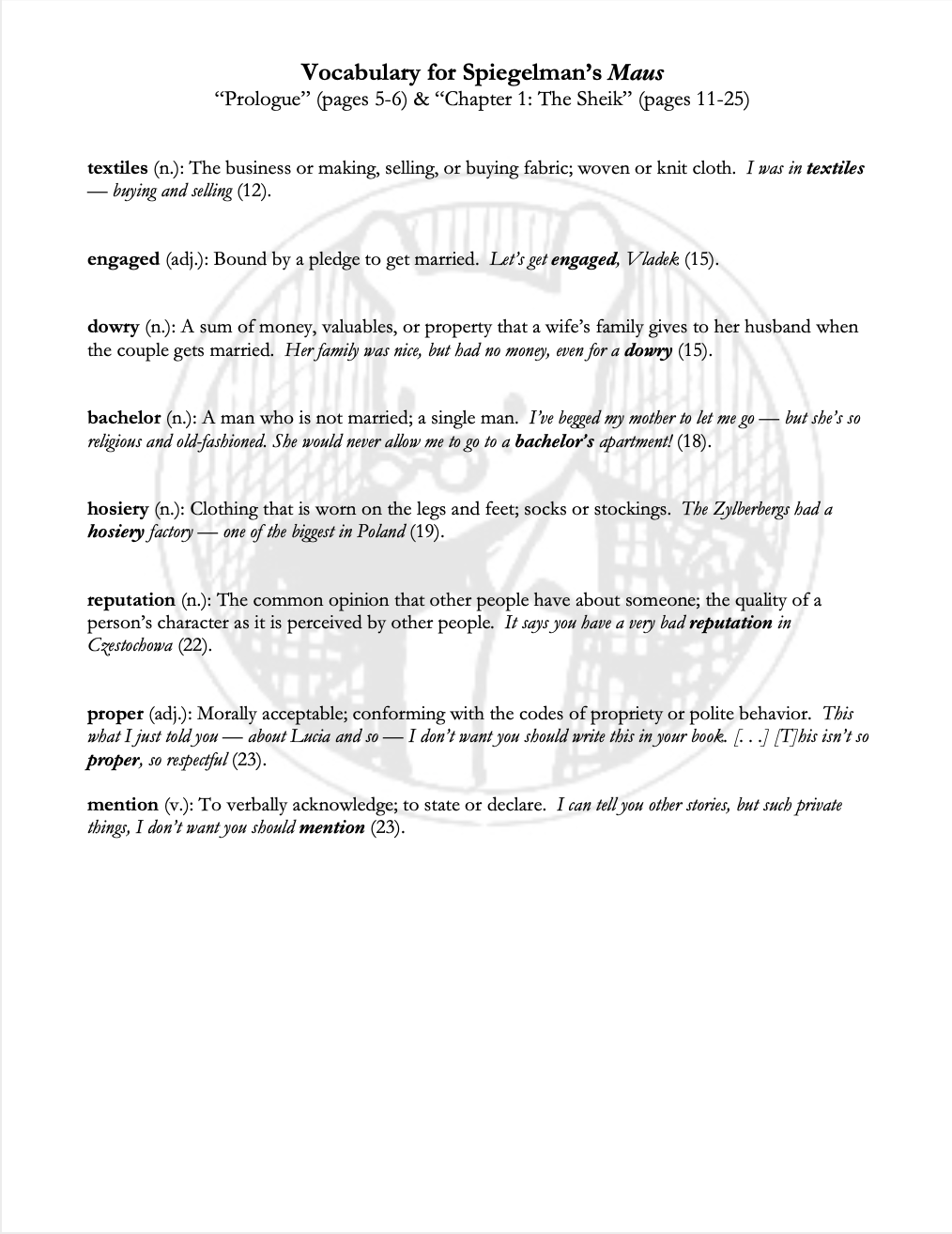• Vocabulary Lists: Lists of 8 vocabulary words for every chapter, complete with definitions and sample sentences with the words as they are used in Maus. A total of 80 words. (10 pages)