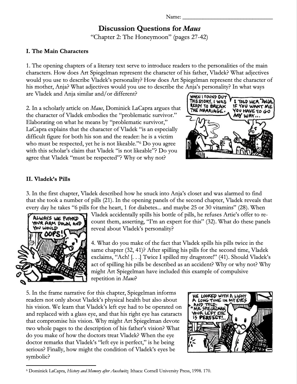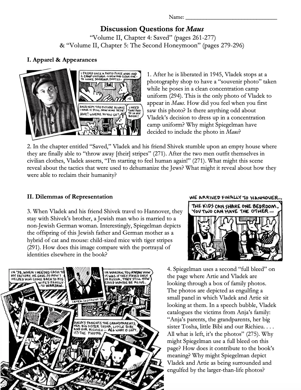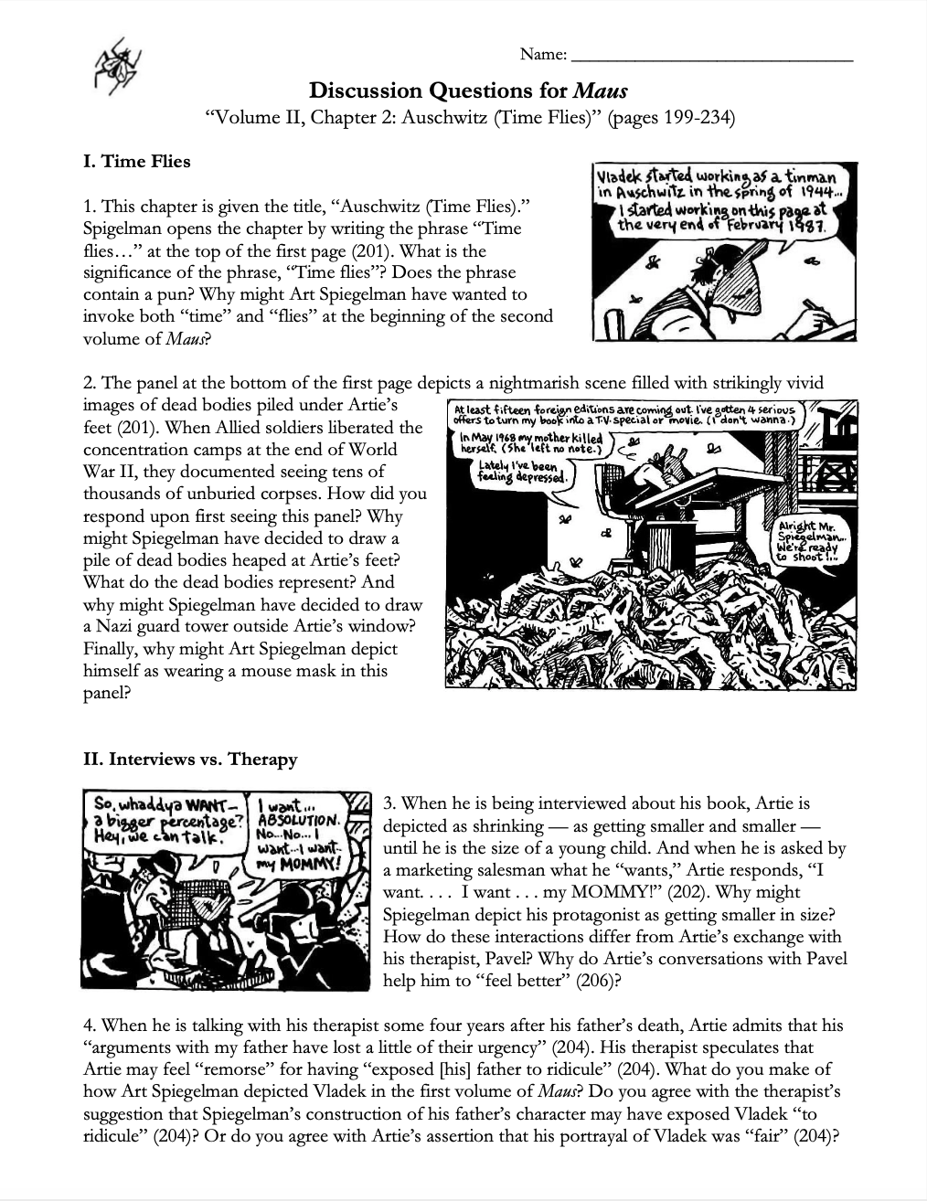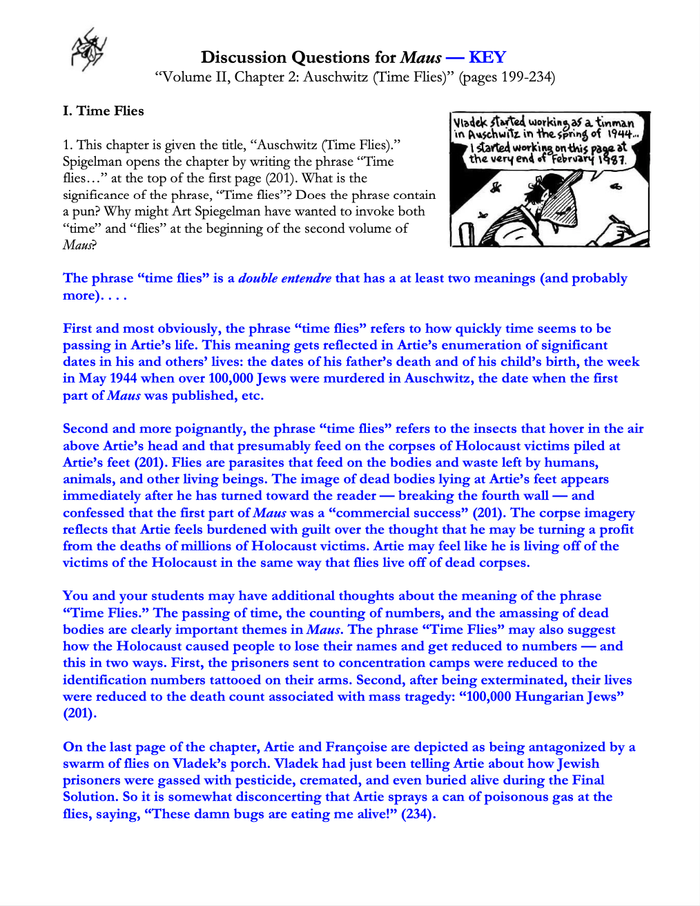 • Discussion Question Answer Keys: The answer keys to the discussion questions are informed by cutting-edge scholarship by historians and literature professors who specialize on topics like the Holocaust and Spiegelman's Maus. Of course, there is rarely a single "correct" answer for any question; rather, the discussions questions are made up of higher-order questions designed to foster lively exchanges and interpretive debates among students. They challenge students to build interpretive arguments that require the support of carefully selected textual evidence. (50 pages)