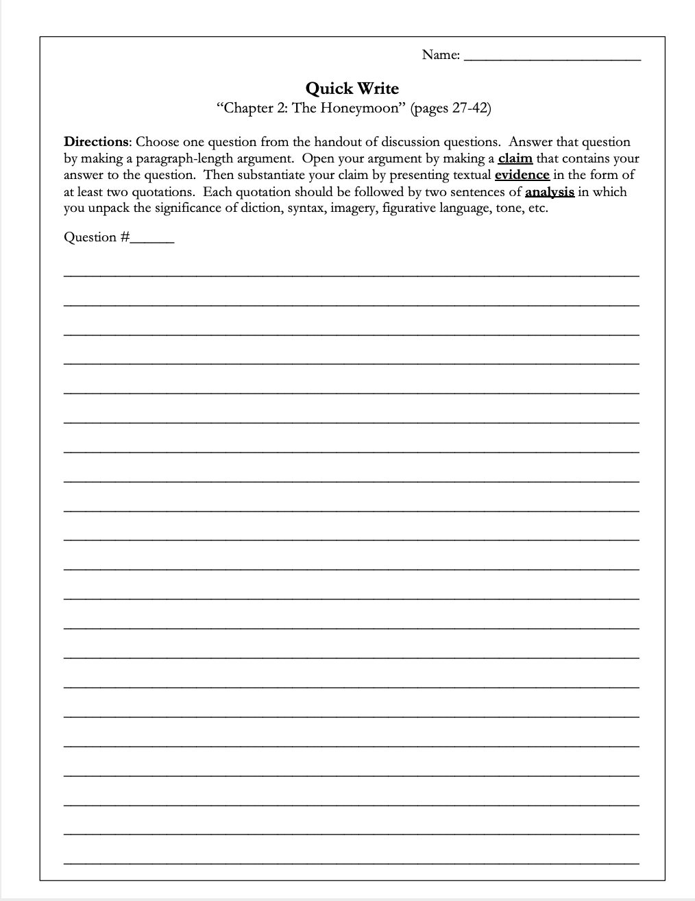 • Quick Writes: A "quick write" can be used at any time in a class to get students to pause and reflect on the text in writing. Introduce a quick write before you begin a discussion to allow students to collect their thoughts. Or roll one out toward the end of a discussion to let students capture and refine their best ideas. (10 pages)