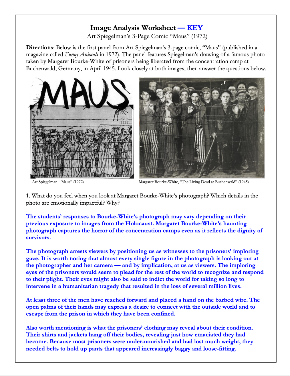 • Pre-Reading Activity: Open this unit by reading and discussing Art Spiegelman's early 3-page comic, "Maus" (which was published in an underground comics magazine called Funny Animals in 1972). In addition to the 3-page comic itself, this unit features a double-sided Image Analysis Worksheet in which students encounter questions that will deepen their engagement with Maus. Answer key included. (10 pages)