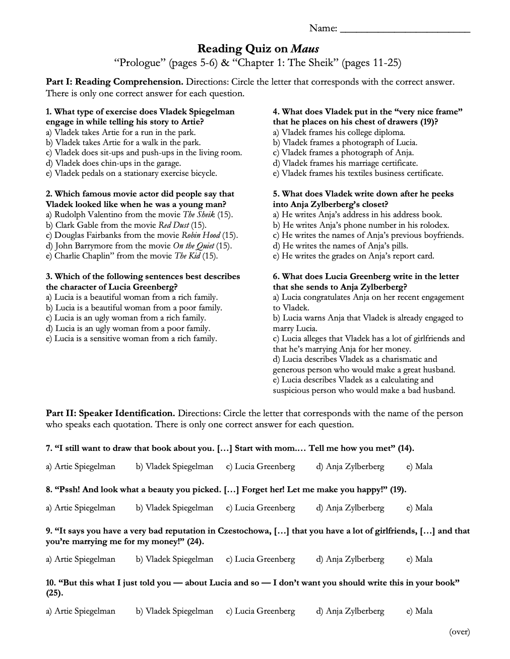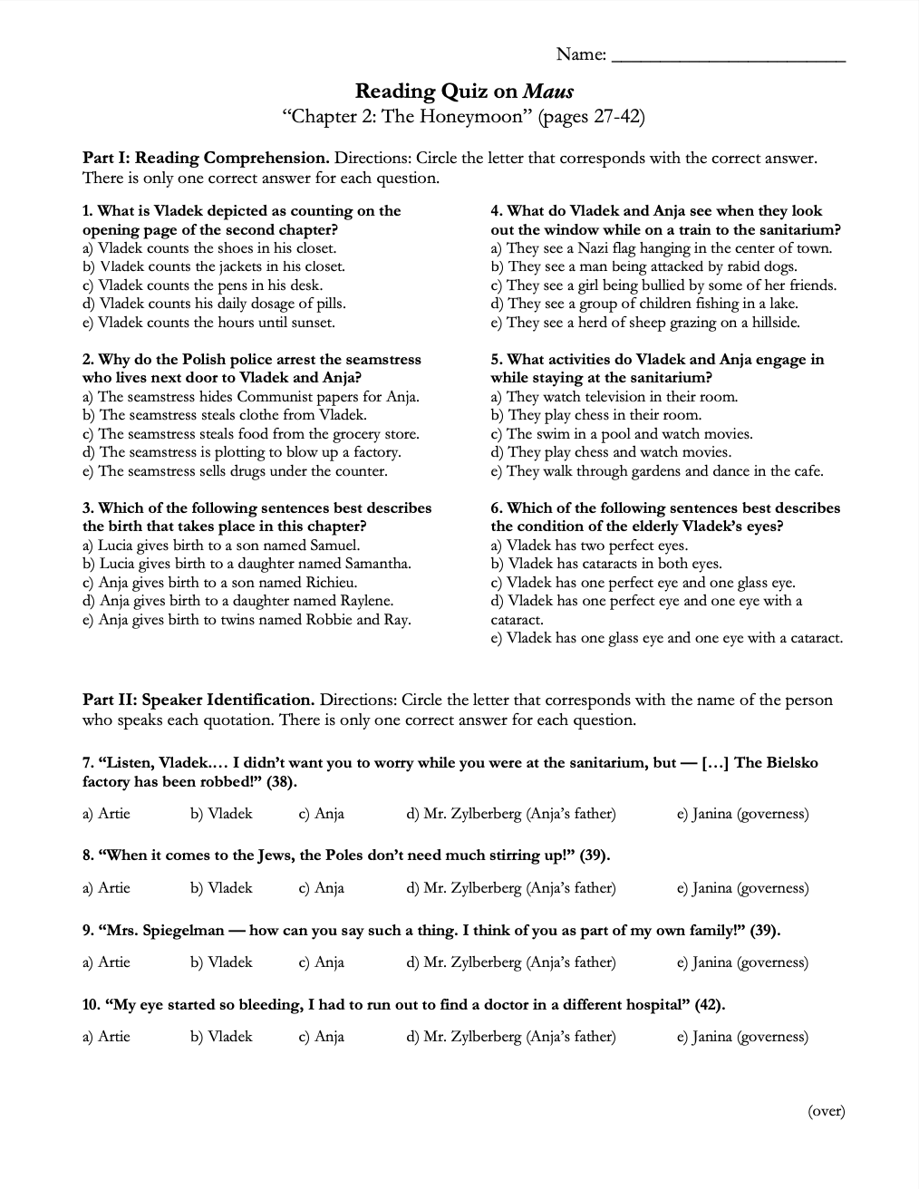 • Quotation Race Worksheet: Students work in pairs to identify the speakers of 30 key quotations from Maus. Introduce this fun activity when you need to mix things up, or to refresh students' memories in preparation for the AP exam. Answer key included. (4 pages)
