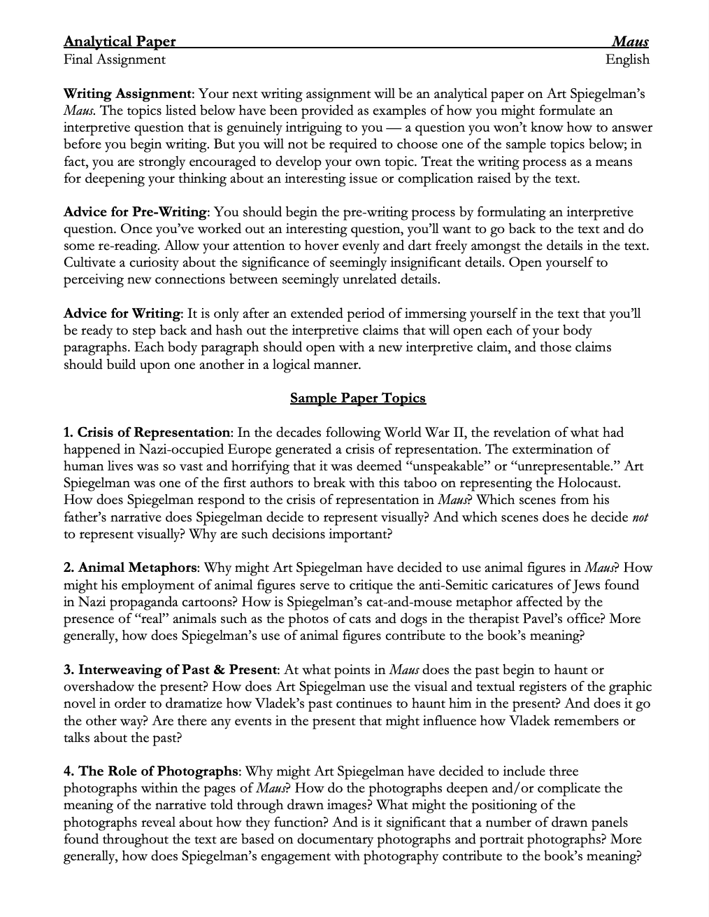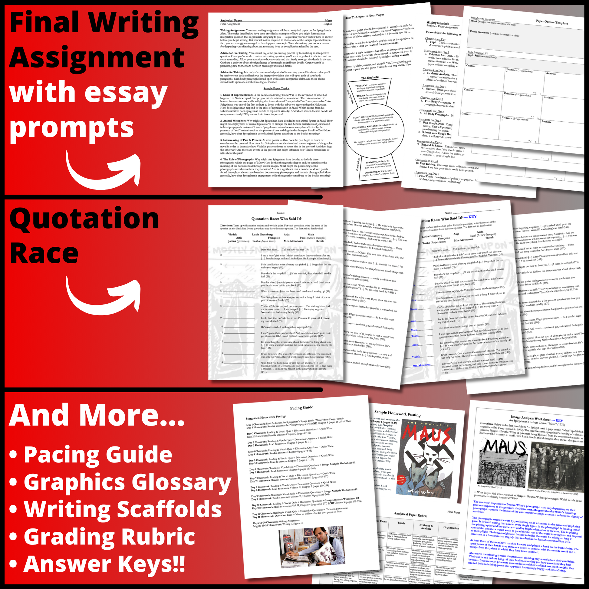 • Analytical Writing Assignment: Challenge students to take their interpretations one step further by writing an analytical paper on Art Spiegelman's complex graphic novel. Let students choose from one of four thought-provoking sample topics — or invite them to develop a similar topic of their own. Writing schedule and rubric included. (4 pages)