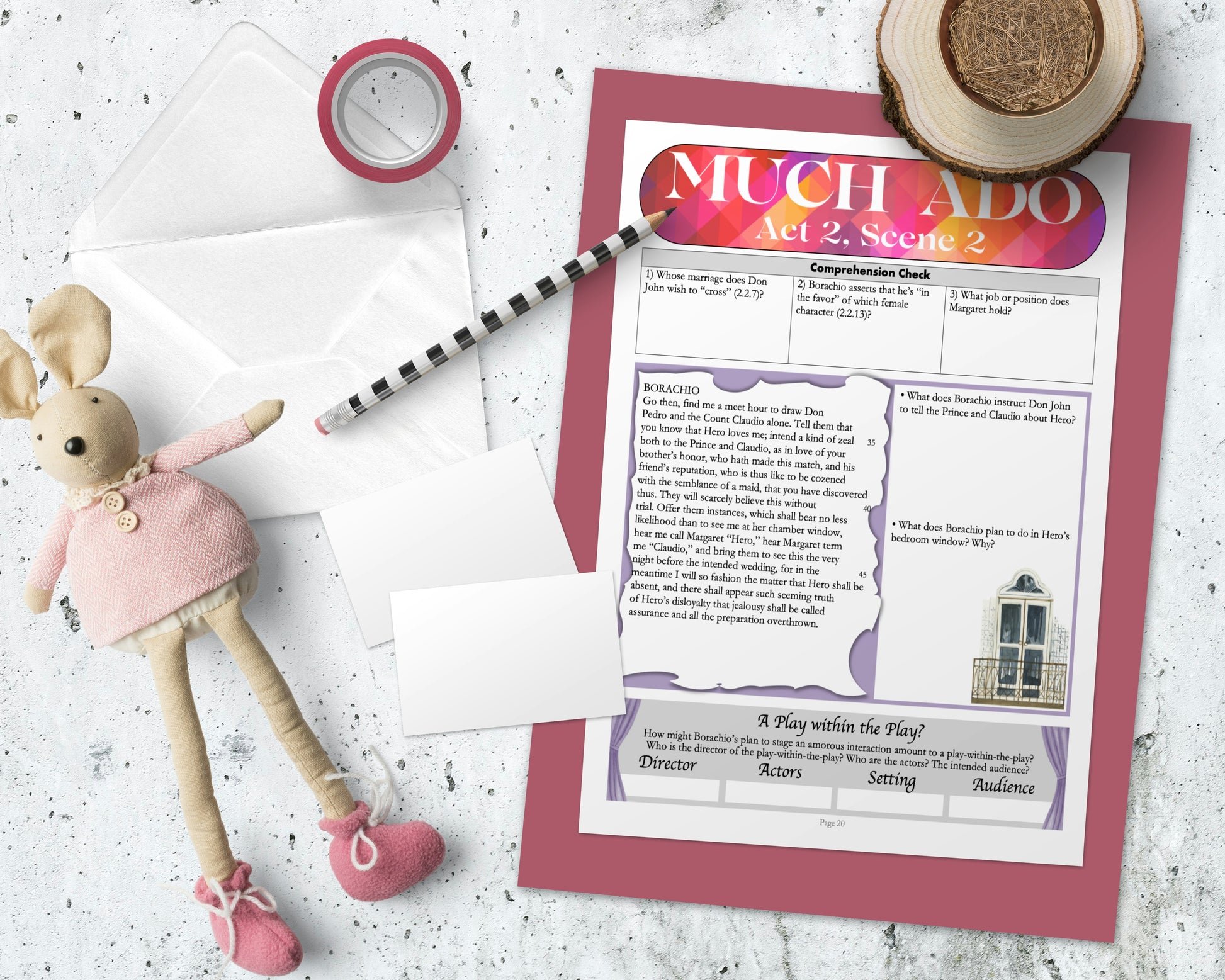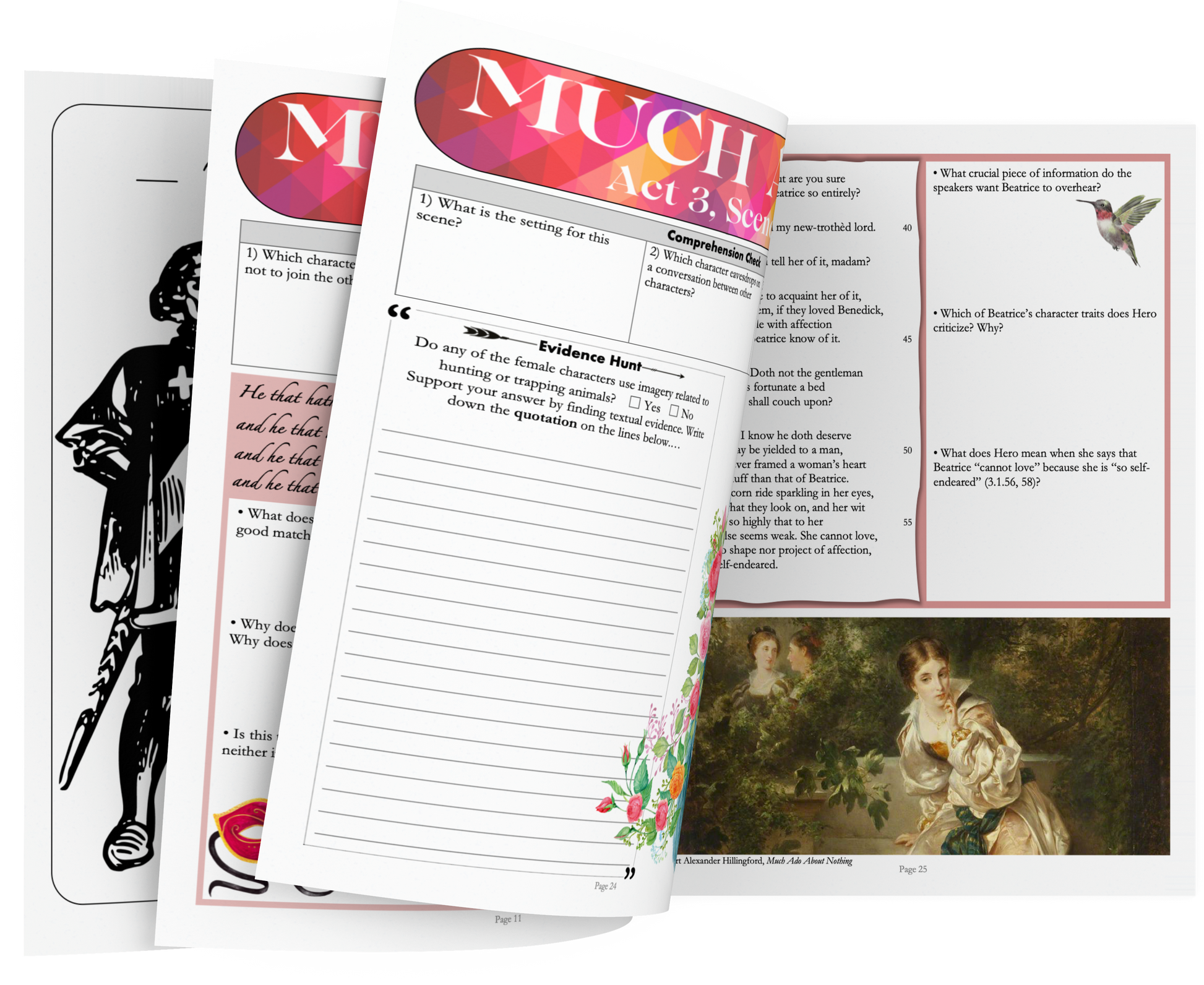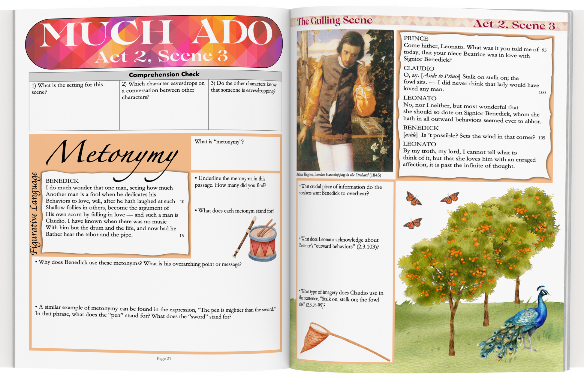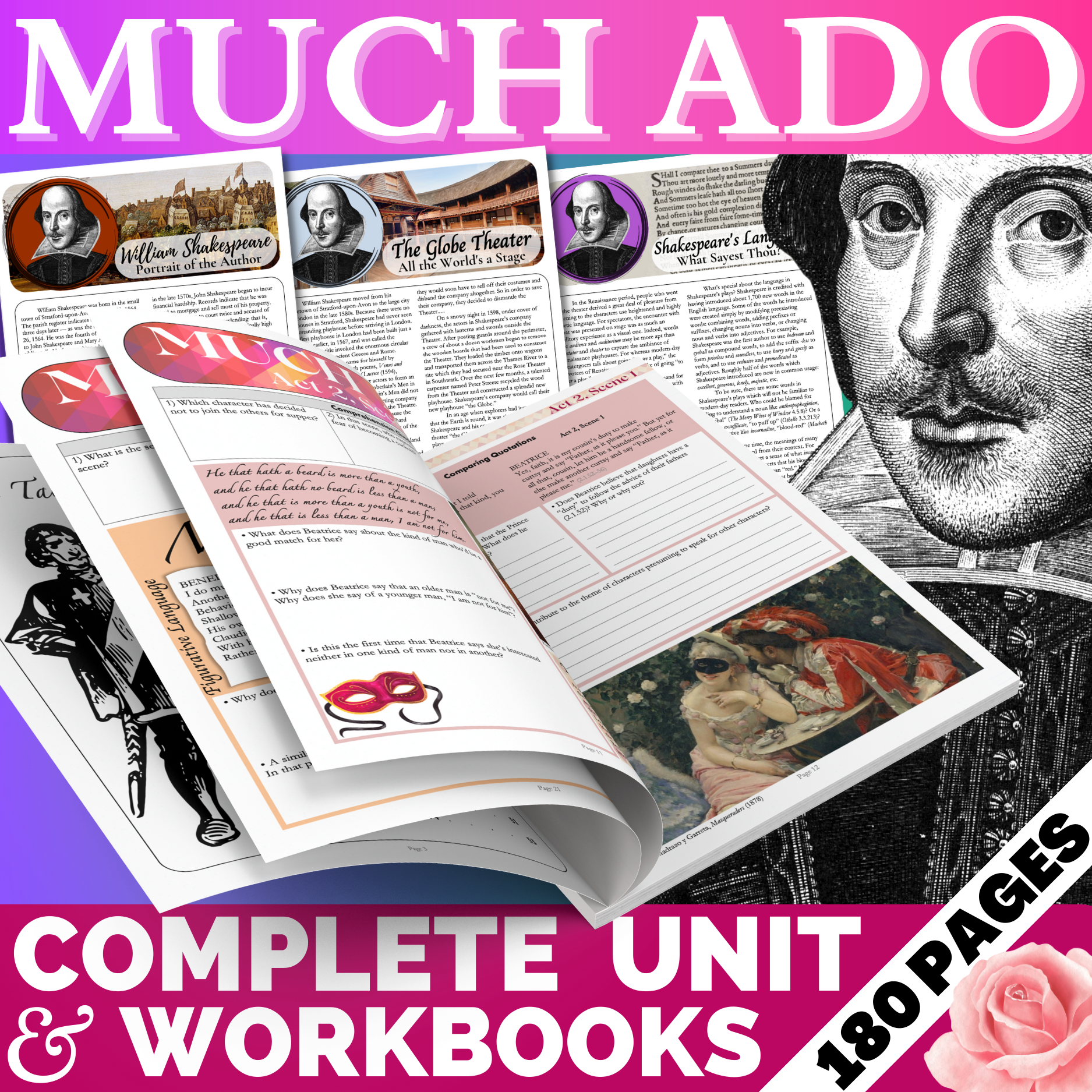 • STUDENT WORKBOOKS on Much Ado About Nothing: The 50-page workbook features colorful and highly engaging worksheets on EVERY scene in Shakespeare's comedy. Each worksheet is divided into sections which invite students to engage with the text in a variety of different ways: