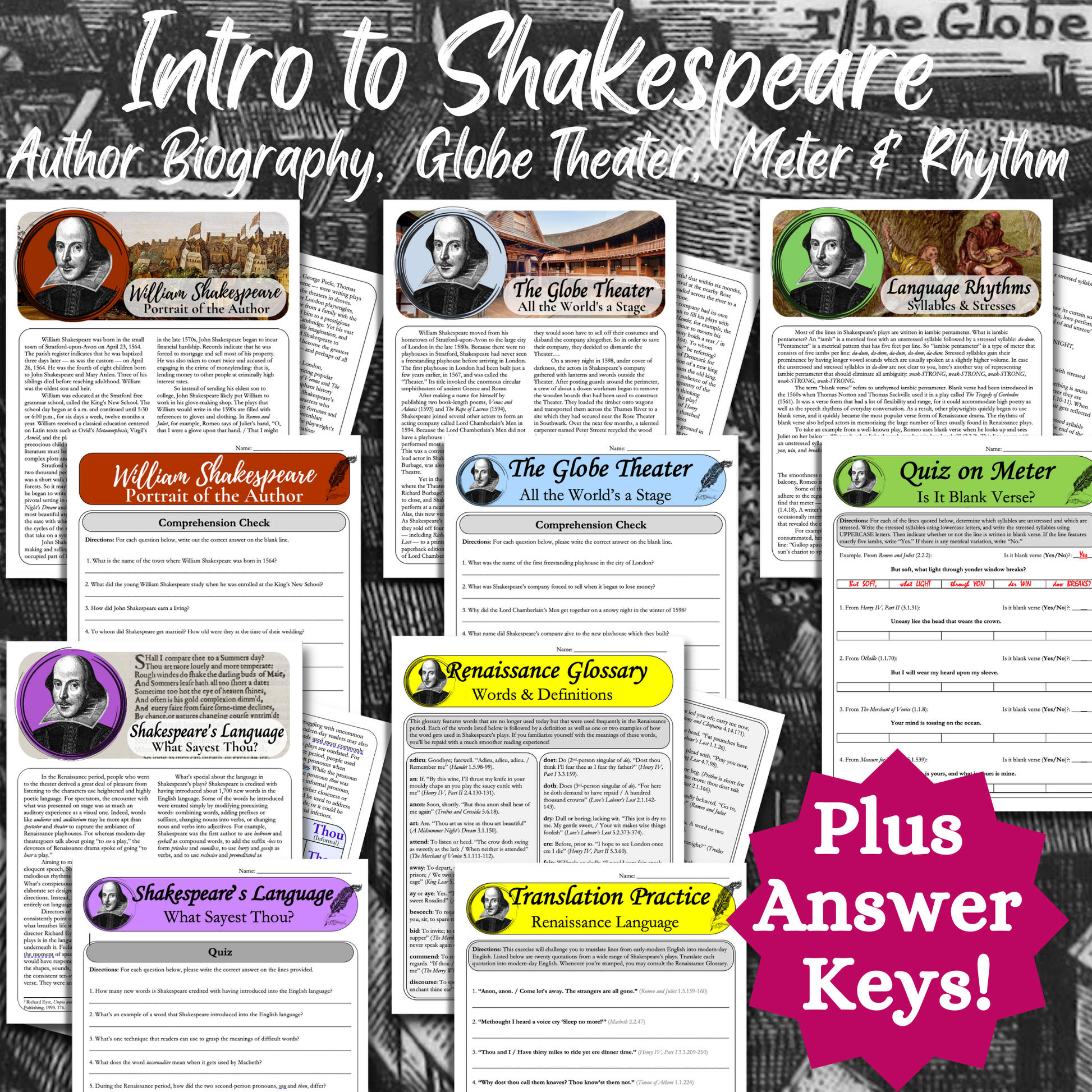 • Introduction to Shakespeare's World: The 30-page introduction includes five handouts covering topics like Shakespeare's biography, the language of Renaissance England, the construction of the Globe Theater, how to recognize iambic pentameter, and more. Every handout is followed by a comprehension check, practice exercise, or quiz. You could spend up to a week with the introductory handouts — or skip them altogether. Answer keys included. (30 pages)