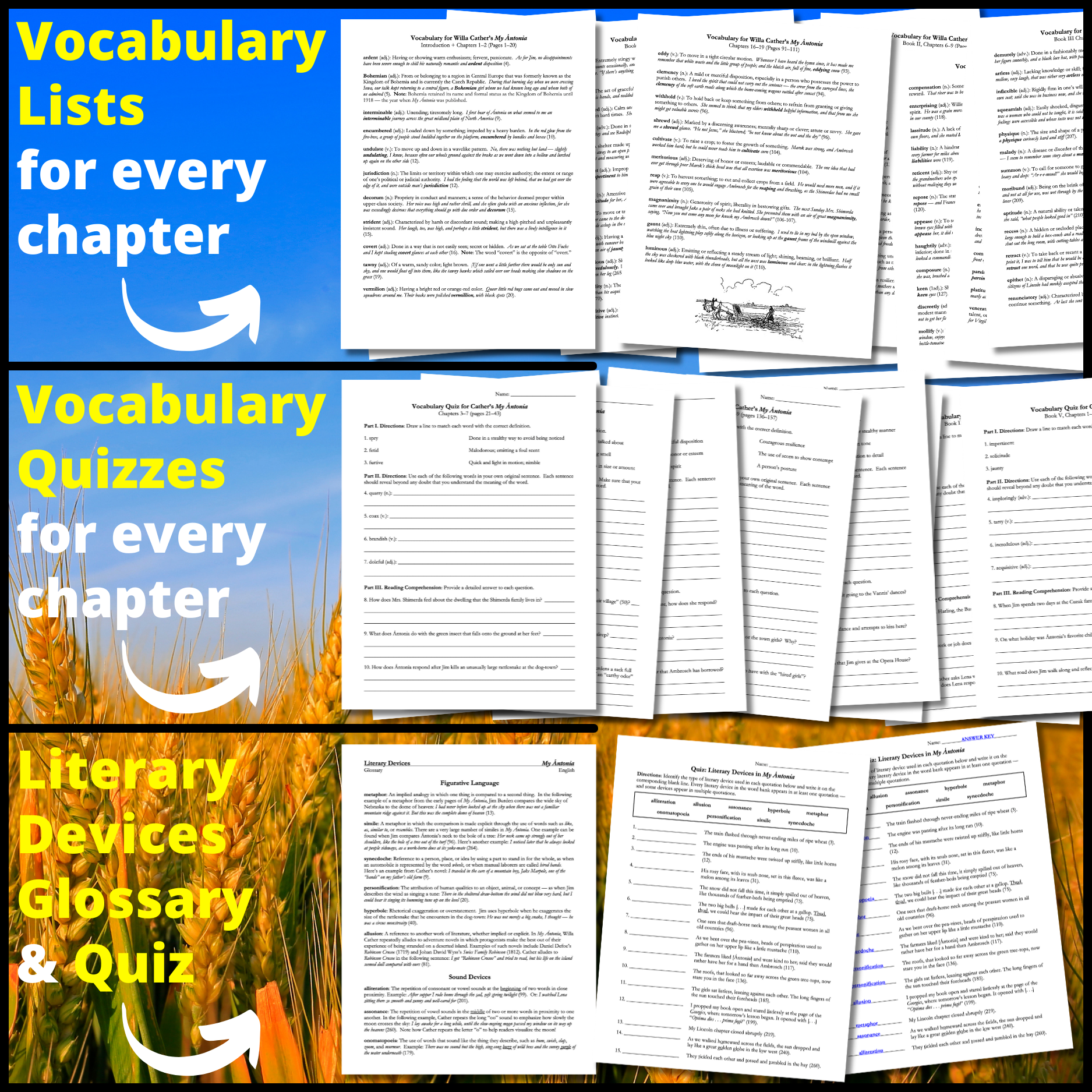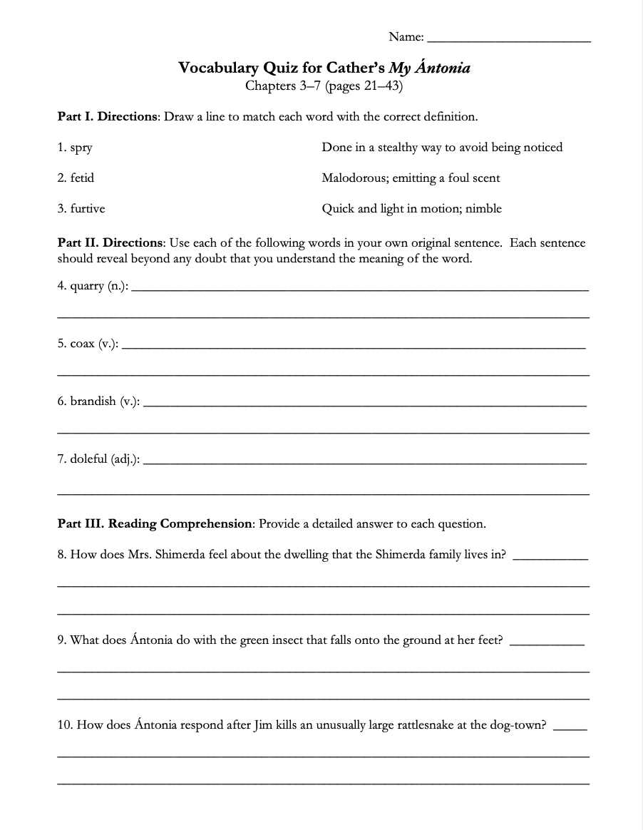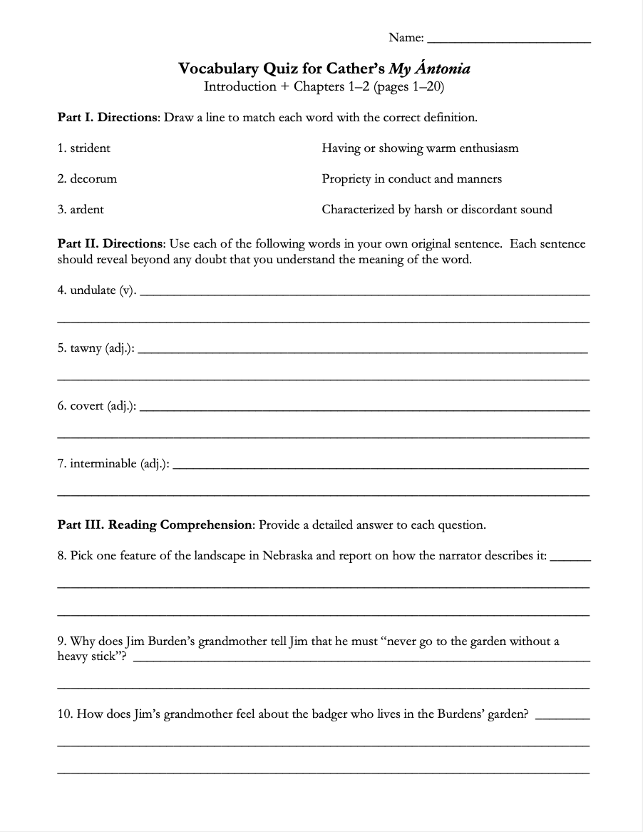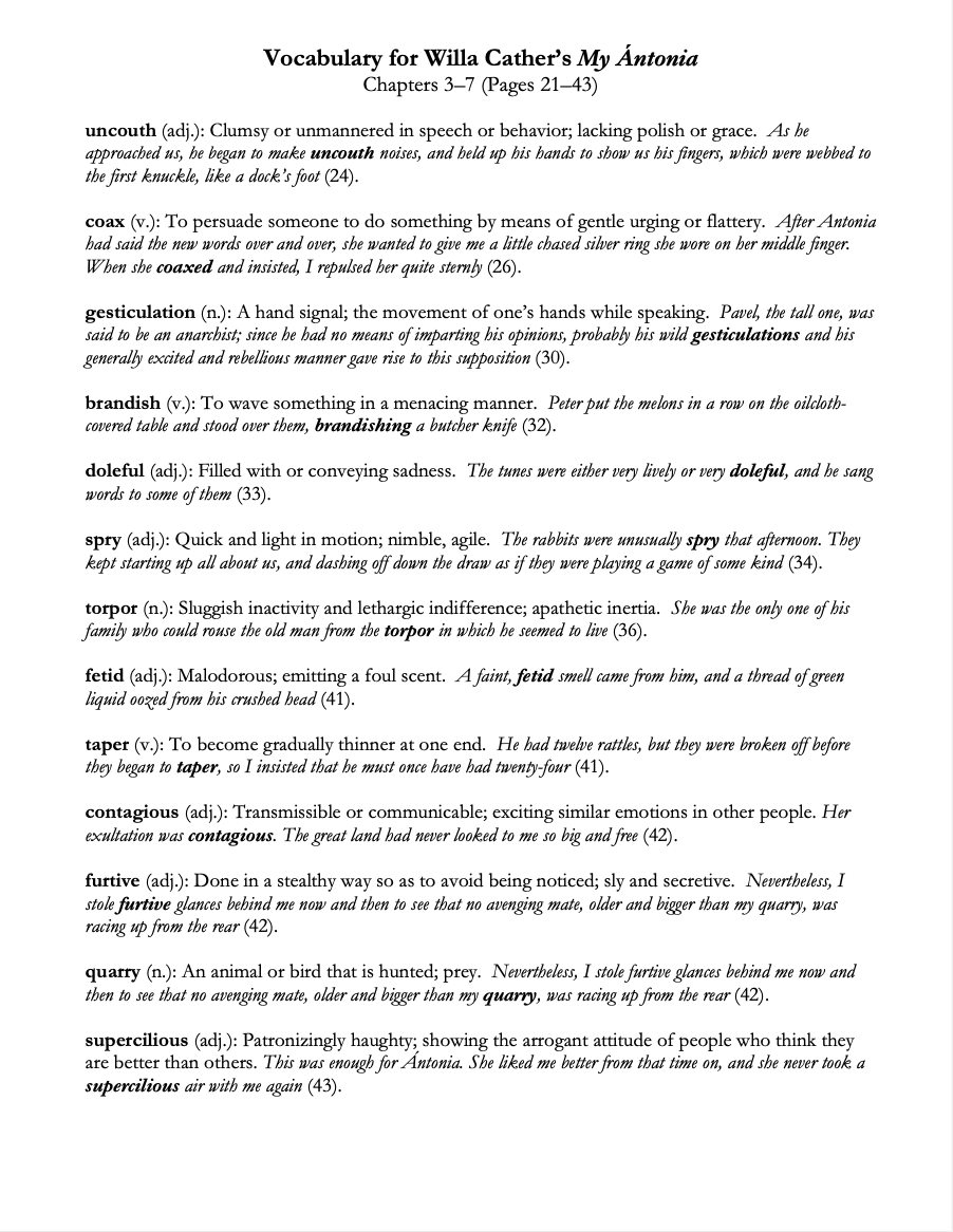 • Vocabulary Lists: Lists of 10-12 vocabulary words for every section of the novel, complete with definitions and sample sentences with the words as used in My Ántonia. A total of over 120 SAT-worthy words. (12 pages)