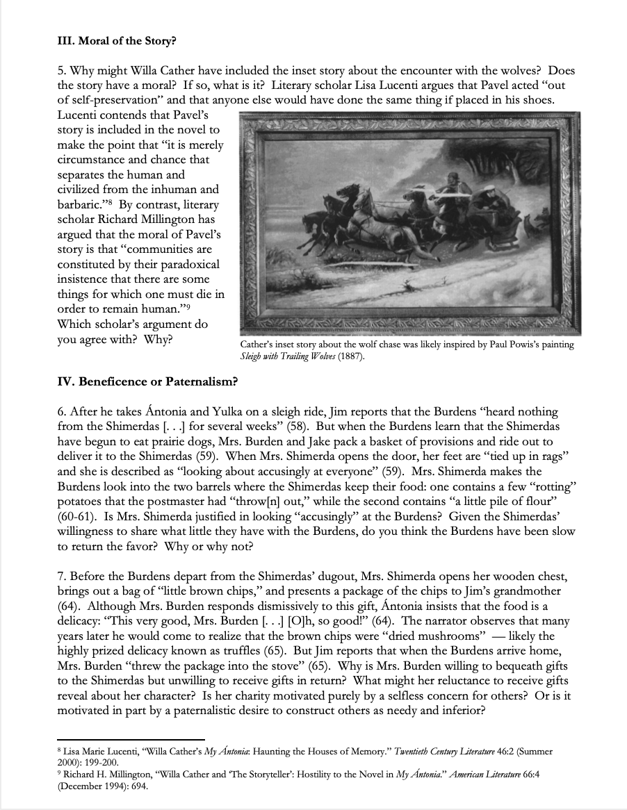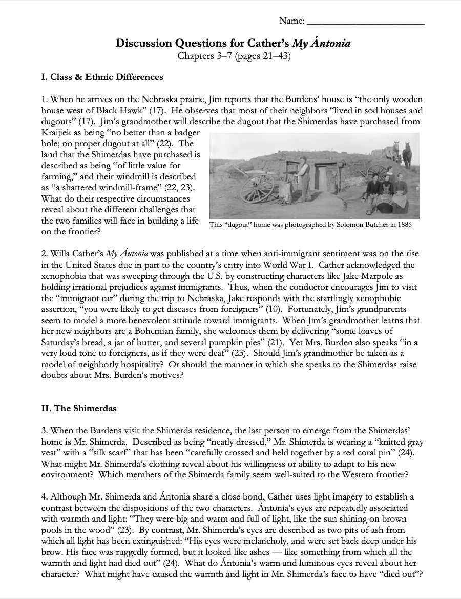 • Portrait of the Author: Willa Cather: This pre-reading handout will provoke students to make connections between Cather's life and central themes in My Ántonia — without spoiling any of the plot details. Includes a follow-up quiz with answer key. (4 pages)