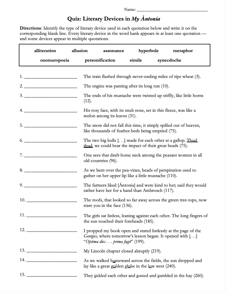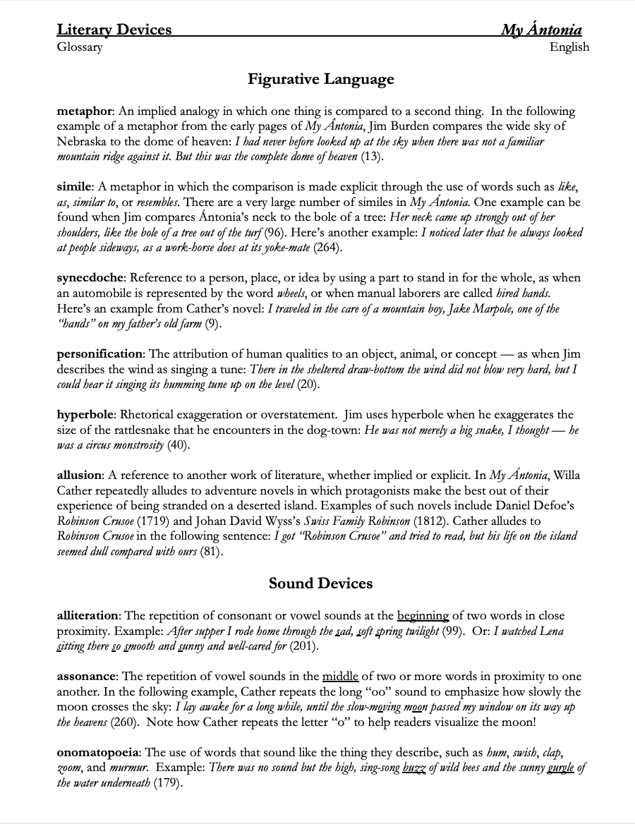 • Literary Devices Quiz: This quiz challenges students to identify the literary devices used in fifteen quotations from My Ántonia. The literary devices include metaphor, simile, personification, hyperbole, allusion, onomatopoeia, and more. This bundle also features a glossary with definitions of the literary devices as well as examples of how each device is used in Cather's novel — so you can review the devices with students before they tackle the worksheet. The worksheet can be used either as a quiz or as a fun refresher. Answer key included. (3 pages)