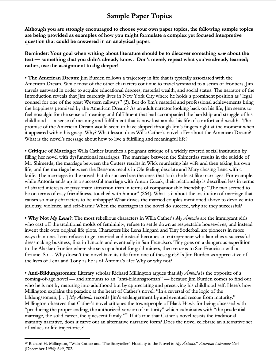 • Analytical Writing Assignment: Challenge students to take their interpretations one step further by writing an analytical paper on Willa Cather's wonderfully complex novel. Let students choose from one of eight profoundly thought-provoking sample topics — or invite them to develop a similar topic of their own. Rubric included. (4 pages)