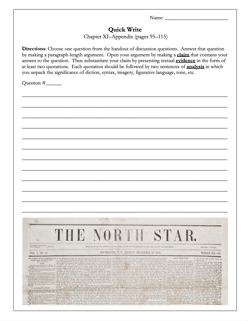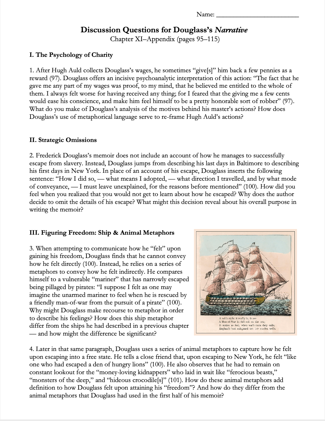 • Discussion Questions: Fifteen pages of higher-order discussion questions guaranteed to inspire profoundly thoughtful class discussions! This unit features double-sided handouts with 8-10 discussion questions for each section of Douglass's Narrative! The discussion questions are the beating heart of this curriculum. Every question is grounded in concrete textual details and challenges students to think critically about their significance. They challenge students to build interpretive arguments that require the support of carefully selected textual evidence — leading to keen interpretive insights! Guaranteed to foster deep thinking and dynamic discussions! (15 pages)
