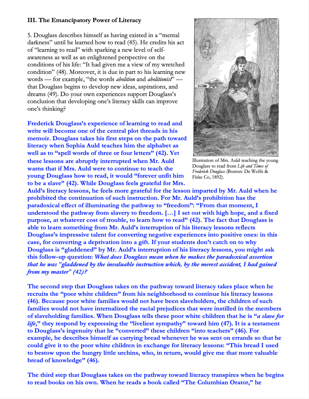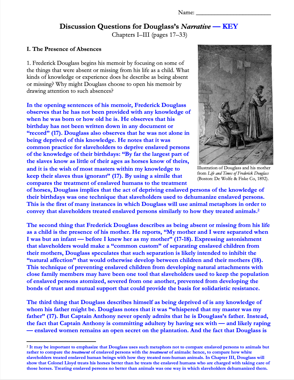 • Discussion Questions ANSWER KEYS: The answer keys to the discussion questions are informed by cutting-edge scholarship by professors who specialize in African-American literature and especially Frederick Douglass: Henry Louis Gates, Saidiya Hartman, Fred Moten, David Blight, etc. Of course, there is rarely a single "correct" answer for any question; rather, the discussions questions are made up of higher-order questions designed to foster lively exchanges and interpretive debates among students. They challenge students to build interpretive arguments supported by carefully selected textual evidence. (35 pages)