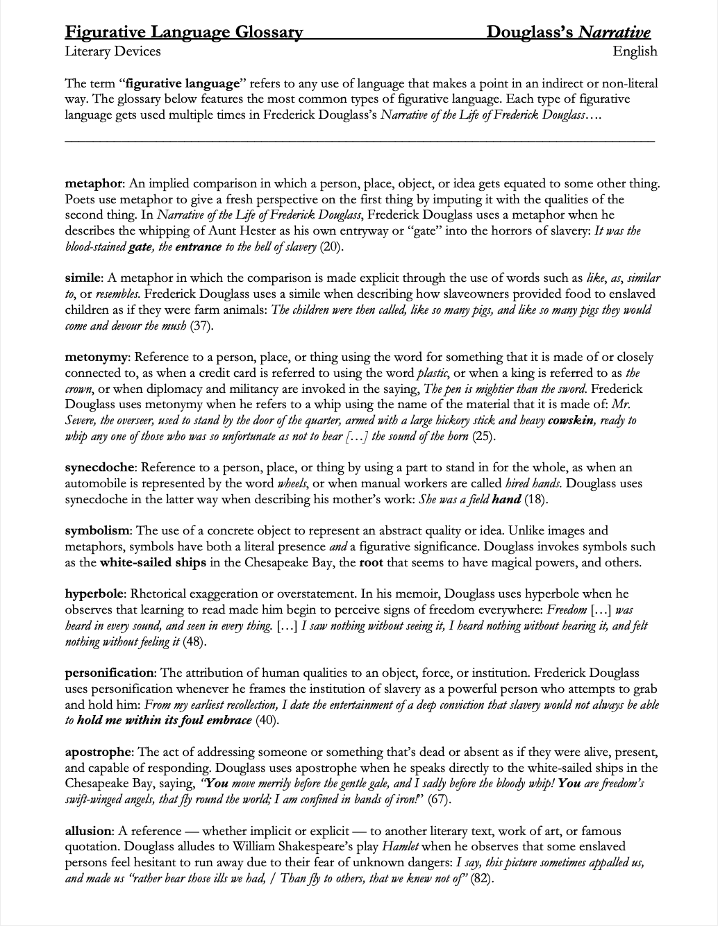• Literary Devices Quiz: This quiz challenges students to identify the literary devices used in thirty quotations from Douglass's memoir. The literary devices include metaphor, simile, hyperbole, personification, apostrophe, allusion, and more. This bundle also features a glossary with definitions of the literary devices as well as examples of how each device is used in Douglass's memoir — so you can review the devices with students before they tackle the quiz. The quiz can be used either for assessment or as a fun refresher. Answer key included. (5 pages)