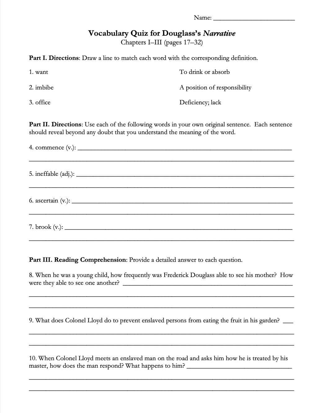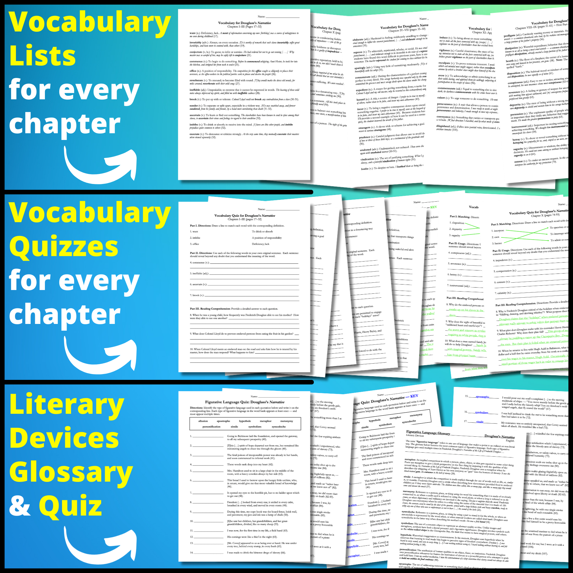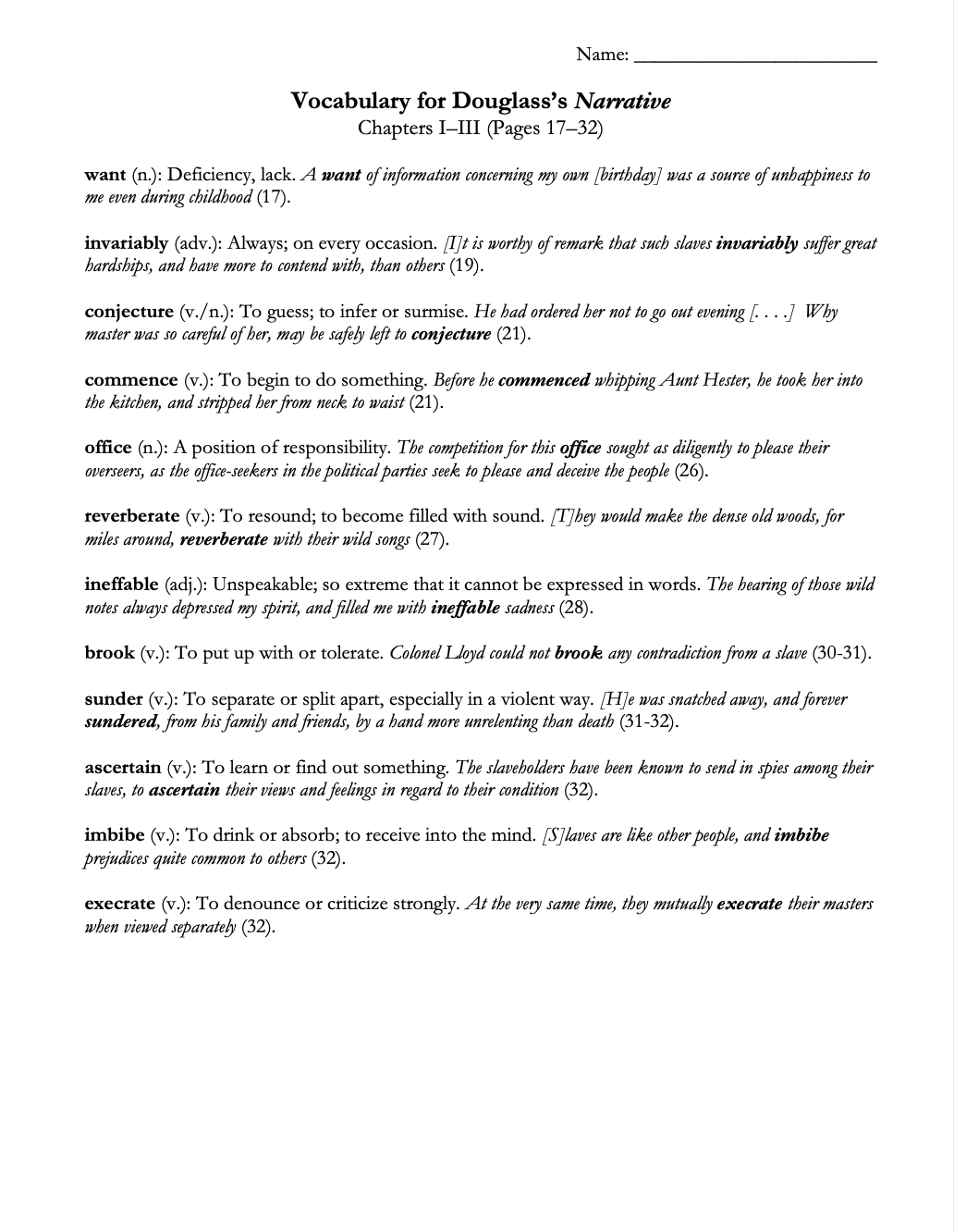 • Vocabulary Lists: Lists of 10-12 vocabulary words for every section of the book, complete with definitions and sample sentences with each word as used in Douglass's Narrative. A total of over 60 SAT-worthy words. (5 pages)