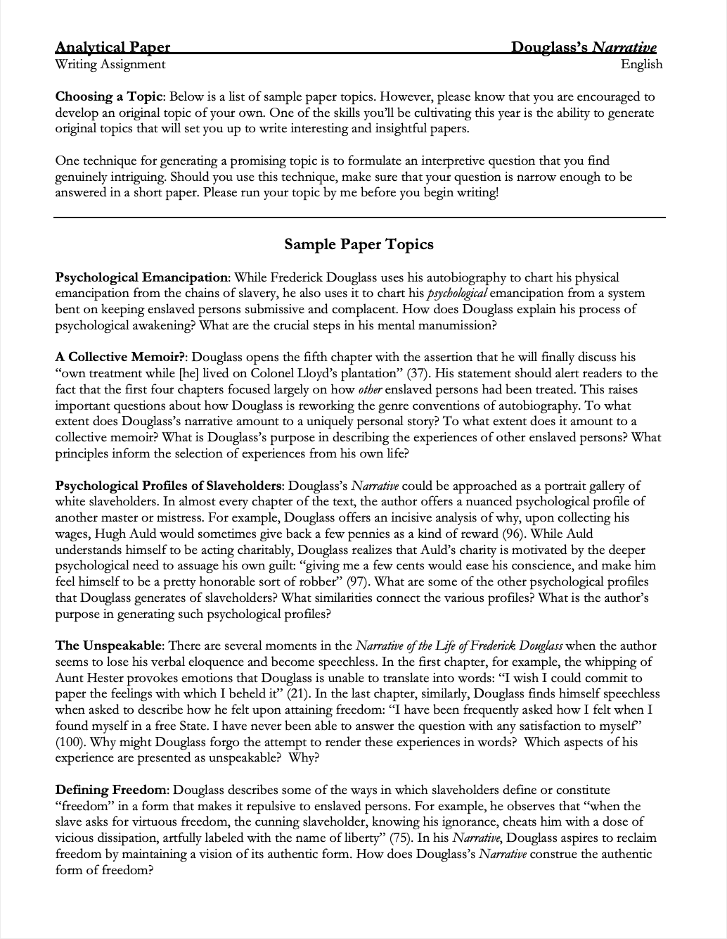 • Writing Assignment: Challenge students to take their interpretations one step further by writing an analytical paper on Douglass's powerful memoir. Let students choose amongst 5 thought-provoking sample topics — or invite them to develop an original topic of their own. Writing schedule included. Rubric included. (5 pages)