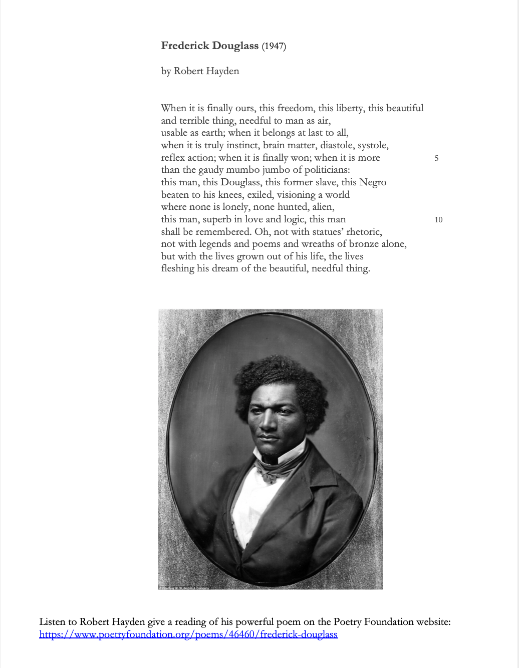 • Poetry Pairing: Seven thematically relevant poems by three twentieth-century African-American poets: Robert Hayden, Lucille Clifton, and Natasha Trethewey. (9 pages)